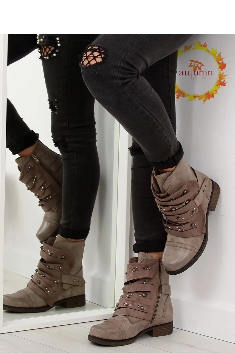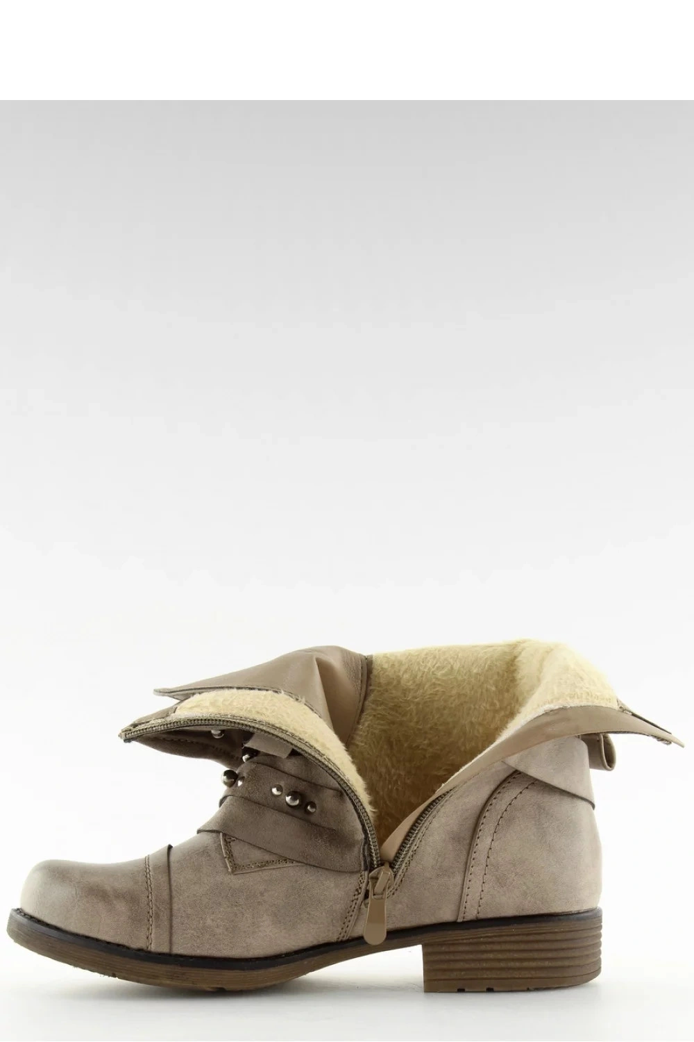 Kultovní dámské boty - bagers. Boty mají nejmódnější límec sezóny zdobený stříbrnými cvočky na svršku. Skutečná hvězda musí zazářit! Originální kombinace ekologické kůže a ekologického semiše (límec) přitahuje pozornost... Nemusíte se bát o pohodlí ? je zajištěn plochým podpatkem a pohodlným kulatým nártem a nazouvání pantoflí je snadné díky zipu na boku svršku. Oteplování - měkká kožešina.