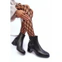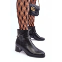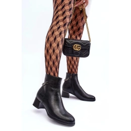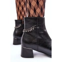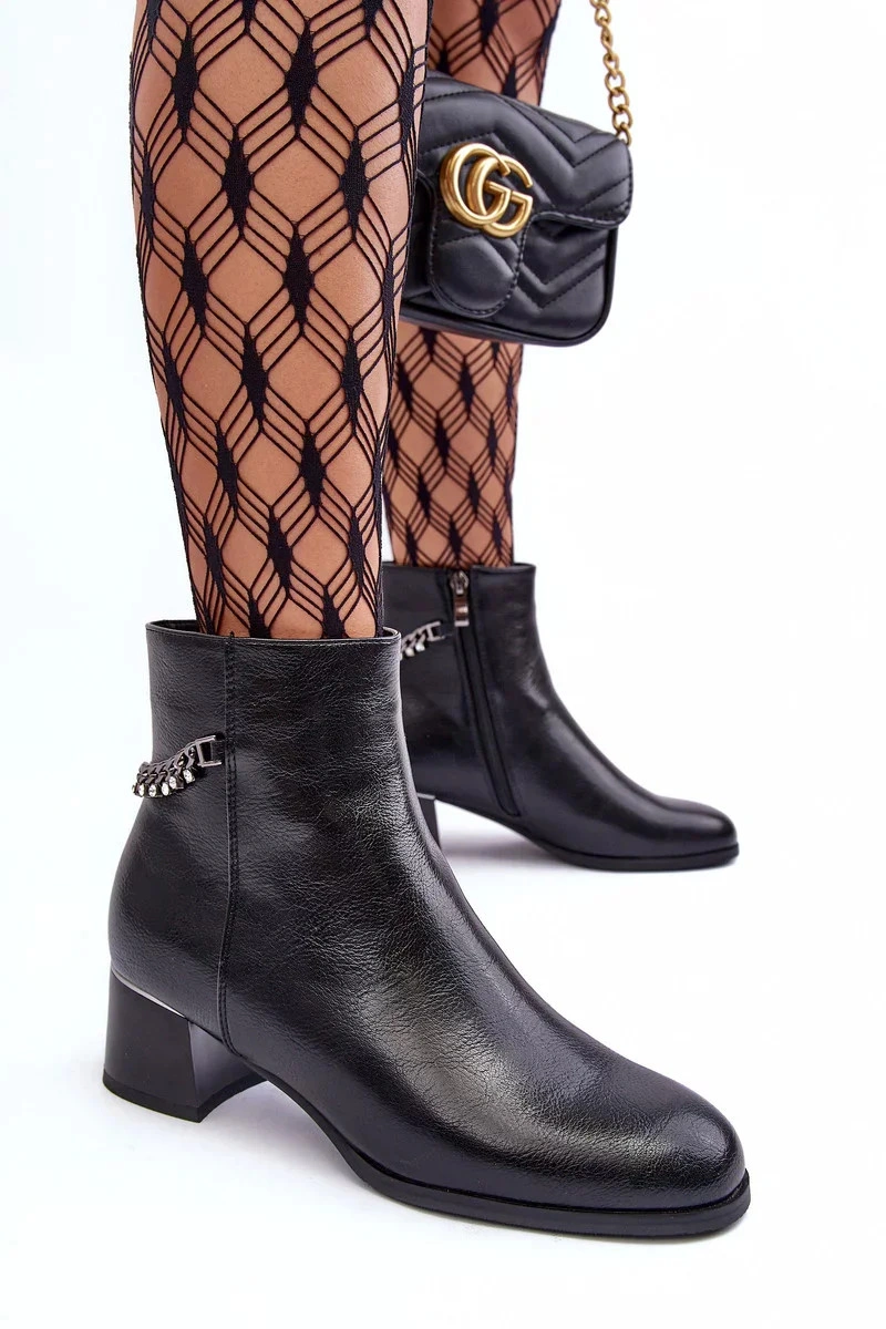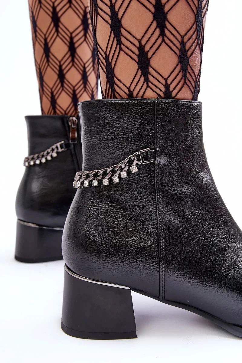 Klasické dámské boty na nízkém podpatku s lesklým prvkem. Vyrobeno z ekologické kůže. Zapíná se na zip na vnitřní straně. Horní část je ozdobena řetězem s kamínky. Vnitřek je zateplen kožešinou. Špička je zesílená a špička je zaoblená. Při výběru velikosti se řiďte tabulkou velikostí.