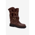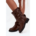 Dámské kozačky z eko kůže jsou módní a pohodlnou volbou na chladnější dny. Vyrobené z eko kůže. Umístěné na plochém podpatku, poskytují pohodlí po celý den a jejich praktický, zasunutý střih zajišťuje rychlé a pohodlné obutí. Model vyniká zvrásněným svrškem sahajícím do poloviny lýtek. Celé doplňují ozdobné pásky s přezkami, které dodávají módní, trochu rockový akcent. Tyto kozačky se skvěle hodí jak do každodenních, ležérních setů s kalhotami nebo legínami, tak i ve spojení s šaty nebo sukní.