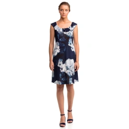 Elegantní dámské květované šaty na ramínka, s kulatým nařaseným výsřihem. Šaty jsou vyrobené z příjemného jersey-polyesteru s příměsí elastanu, které poskytují lehkost, prodyšnost, pružnost i odolnost.