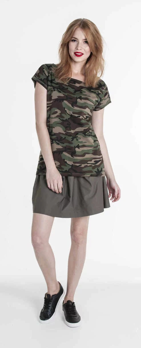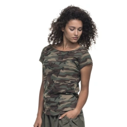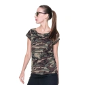 Dámské tričko ušité z hladkého materiálu single jersey s tištěným maskáčovým vzorem. Tričko má dvojté švy a pevné lem. Gramáž: 170g/m2.