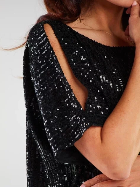 Mini šaty. Ideální na každý večer. V těchto šatech potěšíte každého na každém večírku. Šaty s rozparkem na zádech a ramenou, takže nezůstanete bez povšimnutí. Oversize šaty s elegantním výstřihem a rozparky na rukávech.