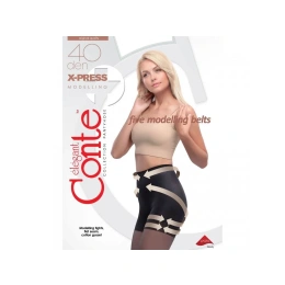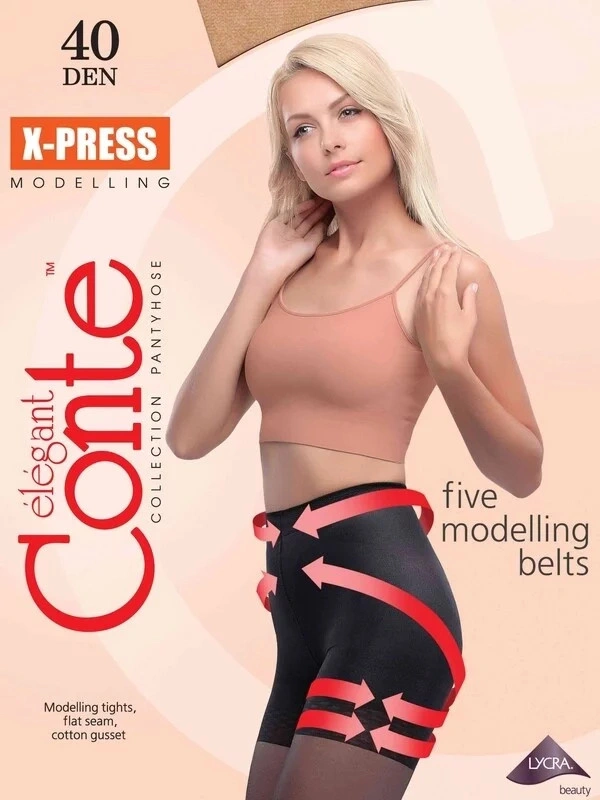 Poloprůhledné 40 den punčochové kalhoty (punčocháče, silonky) Conte X-Press 40 modelující postavu vyrobené z příze LYCRA® BEAUTY. Punčochové kalhoty jsou vhodné pro citlivou pokožku, mají zesílený sed, zesílené špičky a komfortní ploché švy. Malý bavlněný klínek u velikostí 2-S, 3-M a 4-L, velký zadní klín u velikosti 5-XL.