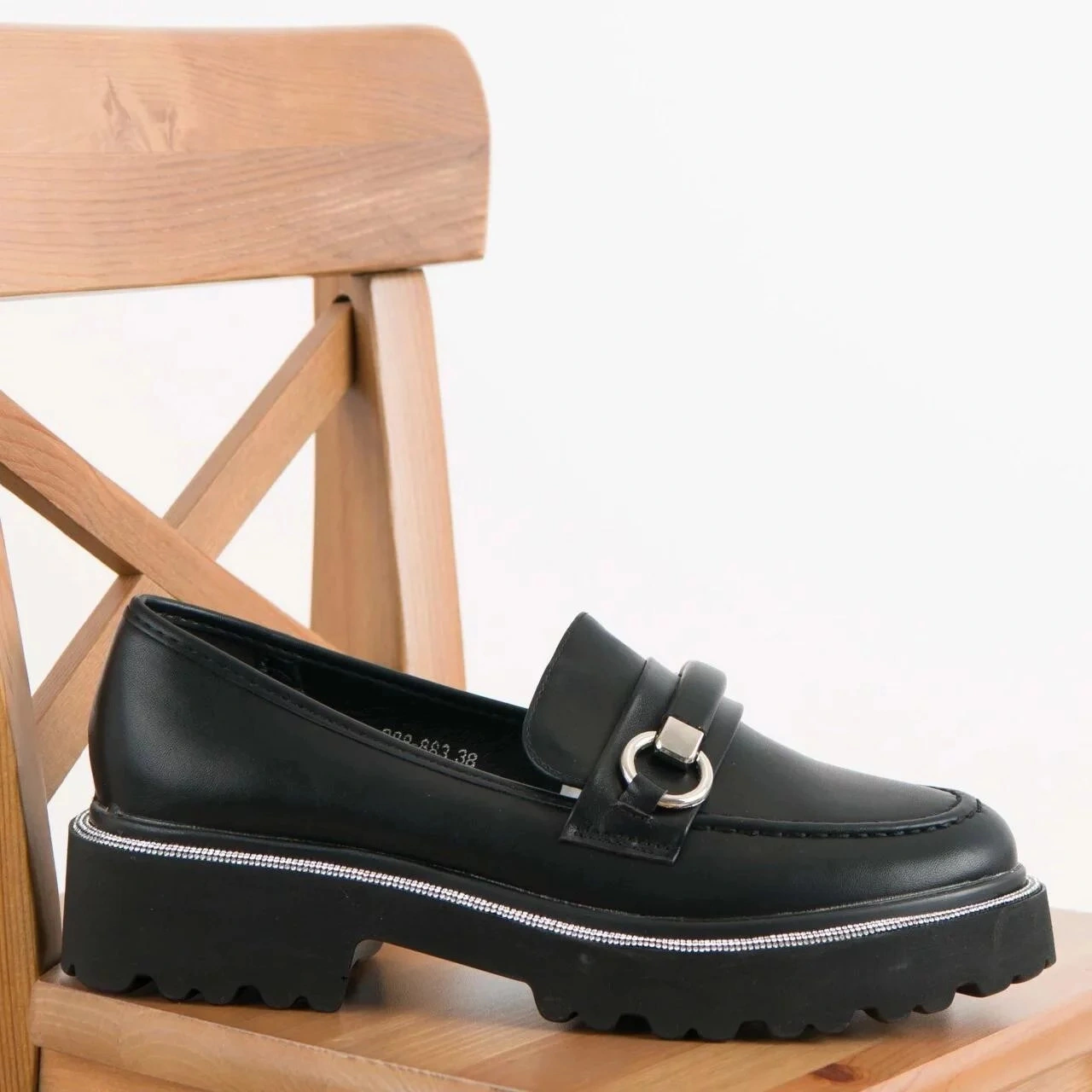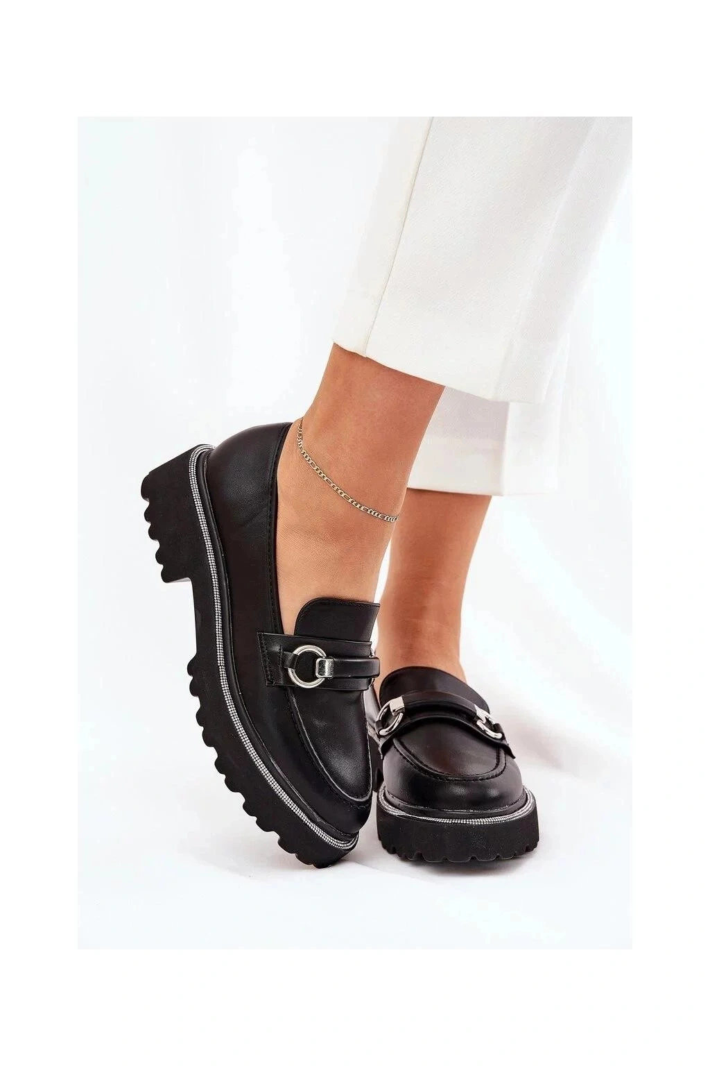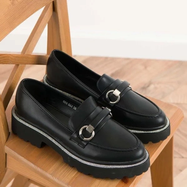 Elegantní mokasíny vyrobené z ekologické kůže. Přední pásek s ozdobou dodává výjimečný charakter a zaoblené špičky zajistí pohodlí po celý den. Na podrážce jsou ozdobené se zirkony, které dodávají lesk. Ideální do každodenního nošení, tyto mokasíny skvěle ladí s různými styly.
