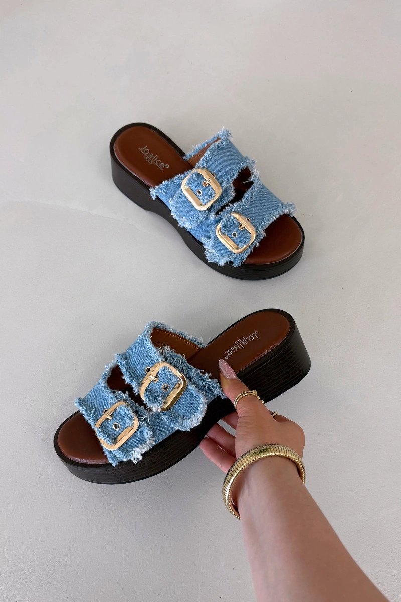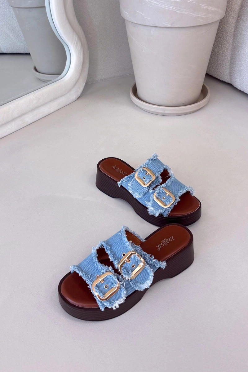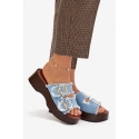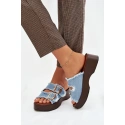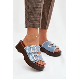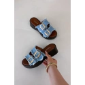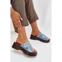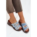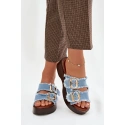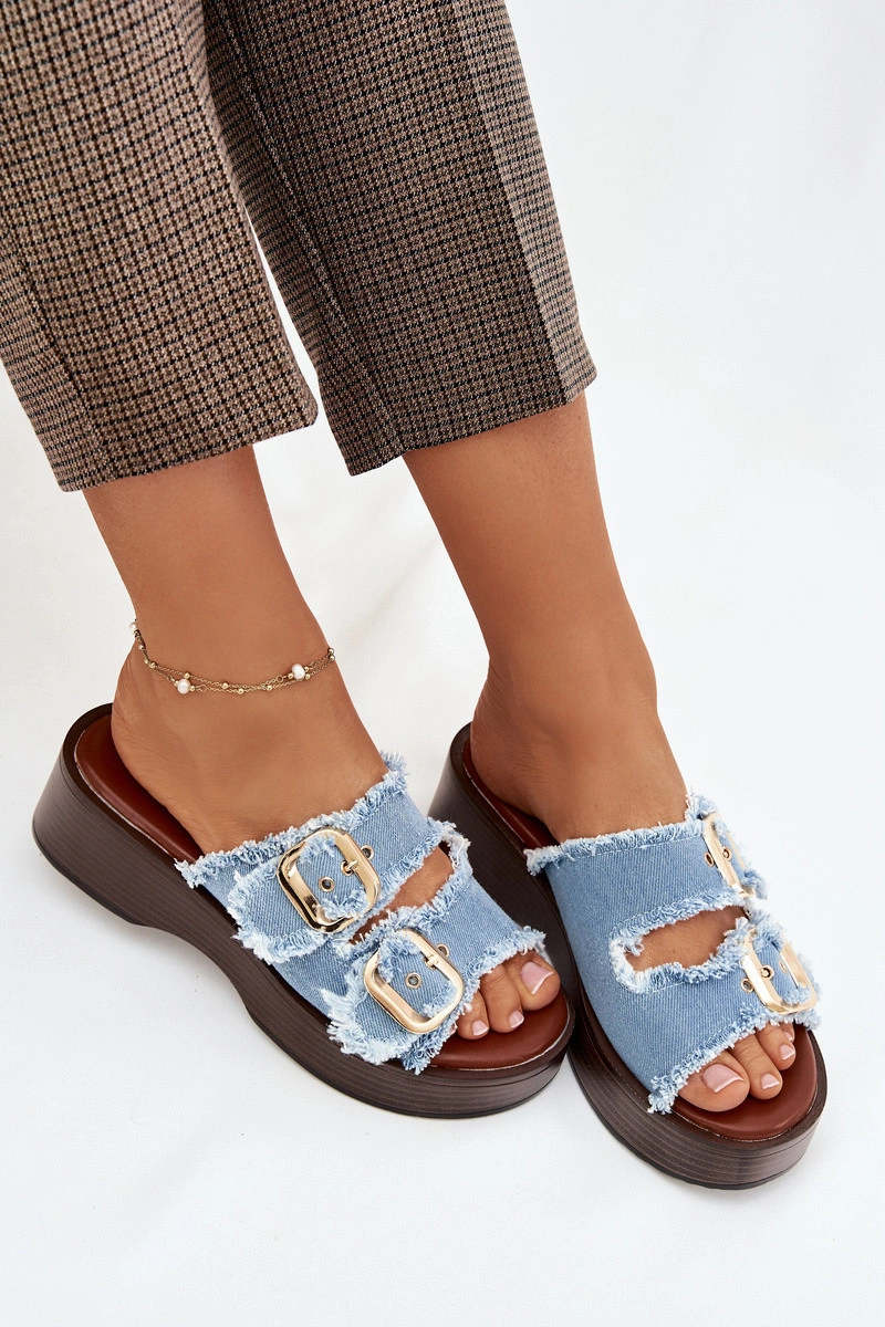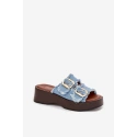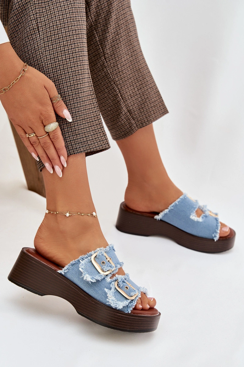 Dámské nazouváky vyrobené z textilního materiálu jsou stylovým a pohodlným návrhem na každý den. Model má dva pásky se zlatými přezkami, které zvýrazňují módní vzhled. Umístěny na platformě. Měkká vložka zvyšuje pohodlí i při delším nošení. Nazouváky jsou ideální pro letní stylizace, spojující funkčnost s elegantním vzhledem. Při výběru velikosti se řiďte tabulkou velikostí.