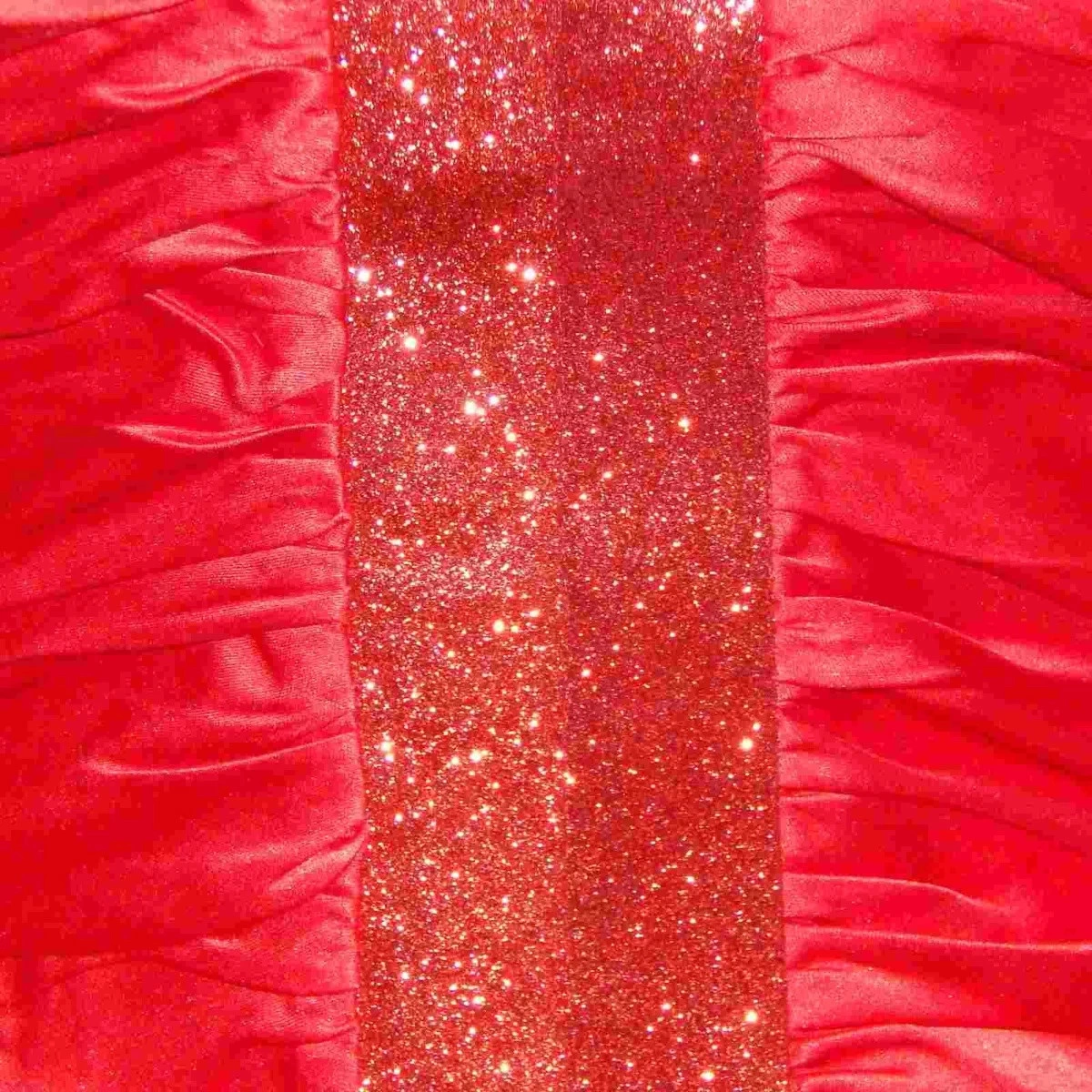 párty a společenské šaty zdobené okolo výstřihu a vertikálně v přední partii šatů ozdobnými pruhy s třpytkami. V přední partii jsou šaty zdobené řasením. Řasené jsou i rukávky. Šaty jsou jen mírně elastické a zapínání je řešeno zadním skrytým zipem. Šaty jsou vybaveny spodničkou a mají polstrovné košíčky.