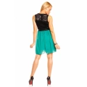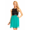 Dámské šaty, které se hodí na párty nebo večírek. Tento model je bez rukávů a bez výstřihu. Velmi rafinovaně působí horní část těchto šatů. Horní díl je krajkový a přešitý pruhy látek, pod krajkou je podšívka, která má střih korzetu. V zadní části je krajka pouze v oblasti lopatek. V pase je koženka, která rozděluje barevné části šatů. Spodní díl sukně je ze dvou vrstev. Spodní díl má krásně zelenou barvu, nikoli mint. Zapínání těchto šatů je v zadní části všitým zipem, který je tak velmi nenápadný. Oblečte si tyto šaty na večírek, večerní posezení s přáteli nebo jinou příležitost a budete mít ten nejzajímavější model.