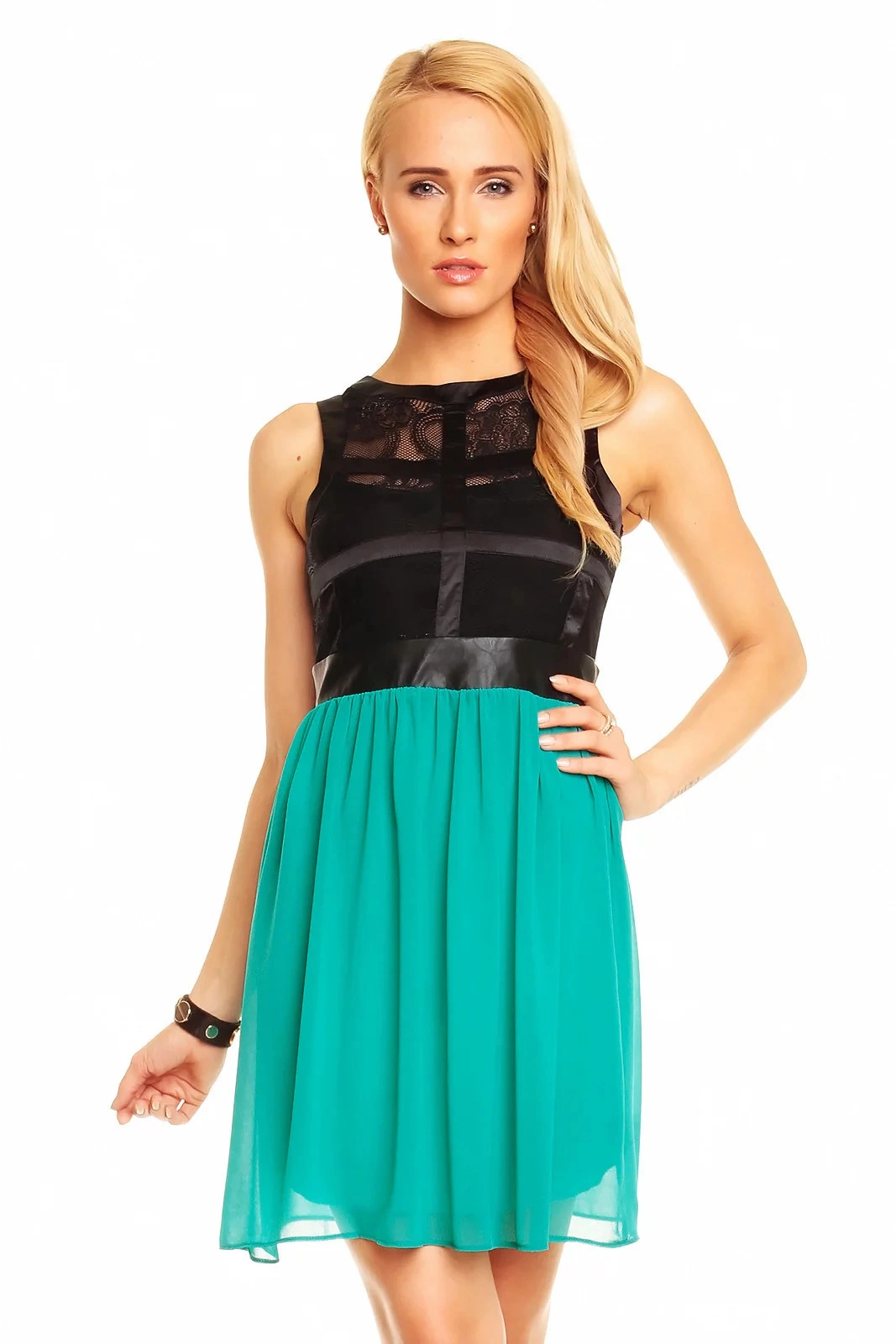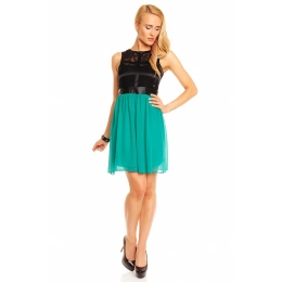 Dámské šaty, které se hodí na párty nebo večírek. Tento model je bez rukávů a bez výstřihu. Velmi rafinovaně působí horní část těchto šatů. Horní díl je krajkový a přešitý pruhy látek, pod krajkou je podšívka, která má střih korzetu. V zadní části je krajka pouze v oblasti lopatek. V pase je koženka, která rozděluje barevné části šatů. Spodní díl sukně je ze dvou vrstev. Spodní díl má krásně zelenou barvu, nikoli mint. Zapínání těchto šatů je v zadní části všitým zipem, který je tak velmi nenápadný. Oblečte si tyto šaty na večírek, večerní posezení s přáteli nebo jinou příležitost a budete mít ten nejzajímavější model.