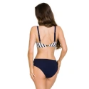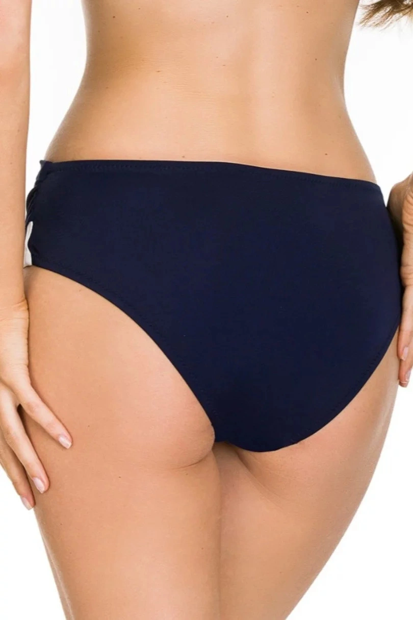 Kalhotky mají klasický střih, který ocení i náročné zákaznice. Spodní část modelu je ušitá z mikrovlákna s tmavě modrými proužky. Vrchní část kalhotek má tmavě modrou barvu. Nařasení v pase zakrývá nedostatky postavy a opticky zeštíhluje pas.
