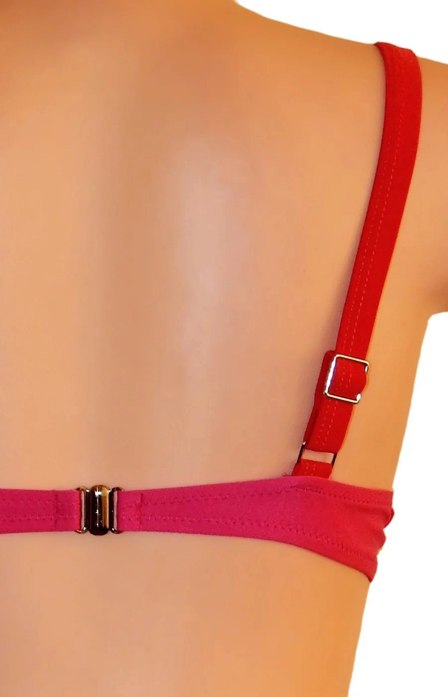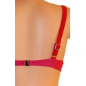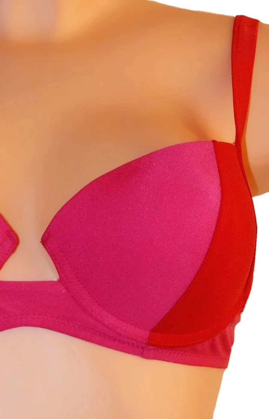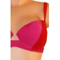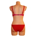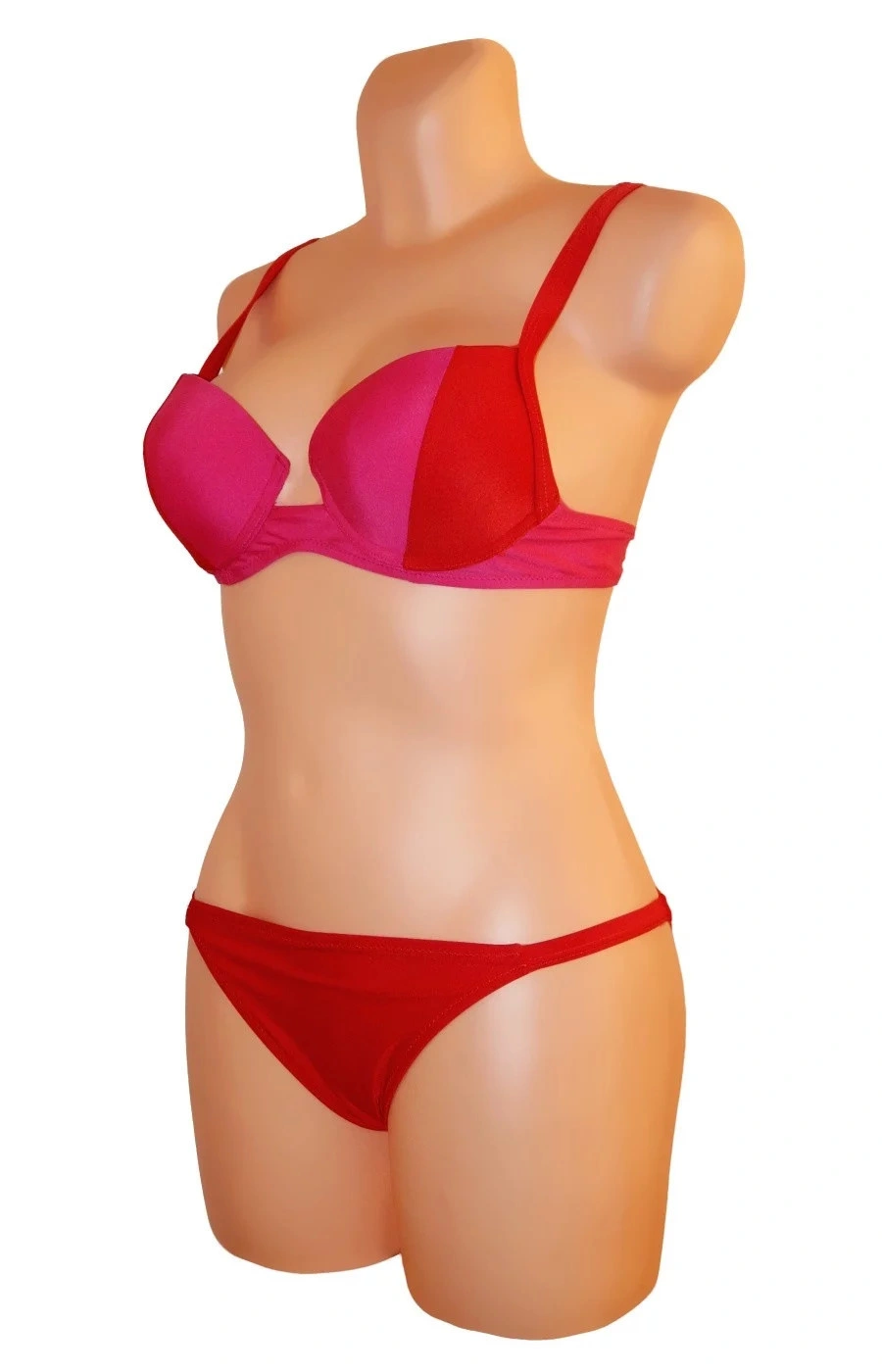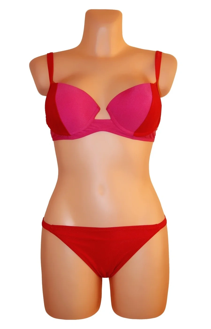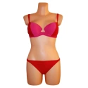 Dámské dvoudílné plavky bikiny ve dvoubarevném provedení. Barvy jsou v červeném odstínu (tmavší a světlejší), viz. obrázky. Podprsenka je vybavena polstrovanými košíčky a kosticemi. Polstrování nelze odejmout. Ramínka jsou nastavitelná a taktéž je nelze odejmout.