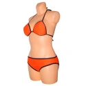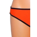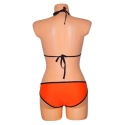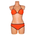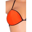 Dámské dvoudílné plavky opalovací, bikiny s polstrovanými košíčky (polstrování nelze odejmout). Plavky jsou vyrobeny v módní oranžové barvě a doplněny černými lemy, které podtrhují kontury obou dílů plavek. Podprsenka se zavazuje tkanicemi na zádech a za krkem.