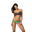 Podprsenka má vyztužené košíčky pokryté pěkným, potištěným vzorem v krásných, exotických barvách. Ve spodní části (i na bocích) podprsenky jsou kostice, které tvarují prsa. Velikosti S, M, L, XL mají také kapsičky na přiložené (vyjímatelné) push-up košíčky. Umístěte je do košíčků a vaše poprsí se zvedne, prsa se k sobě přiblíží a sexy zvětší, čímž vznikne dekolt snů. Obvod podprsenky je elastický, vzadu je zapínání na přezku. Ramínka jsou nastavitelná, můžete je zcela odepnout a pohodlně se opalovat.
