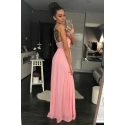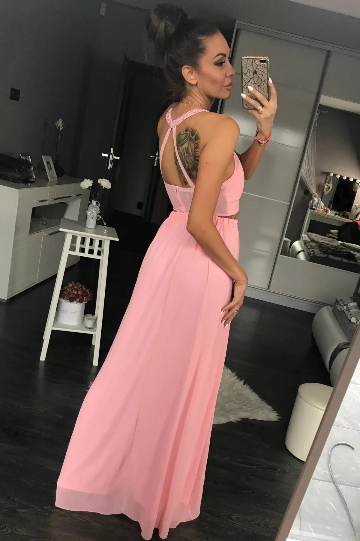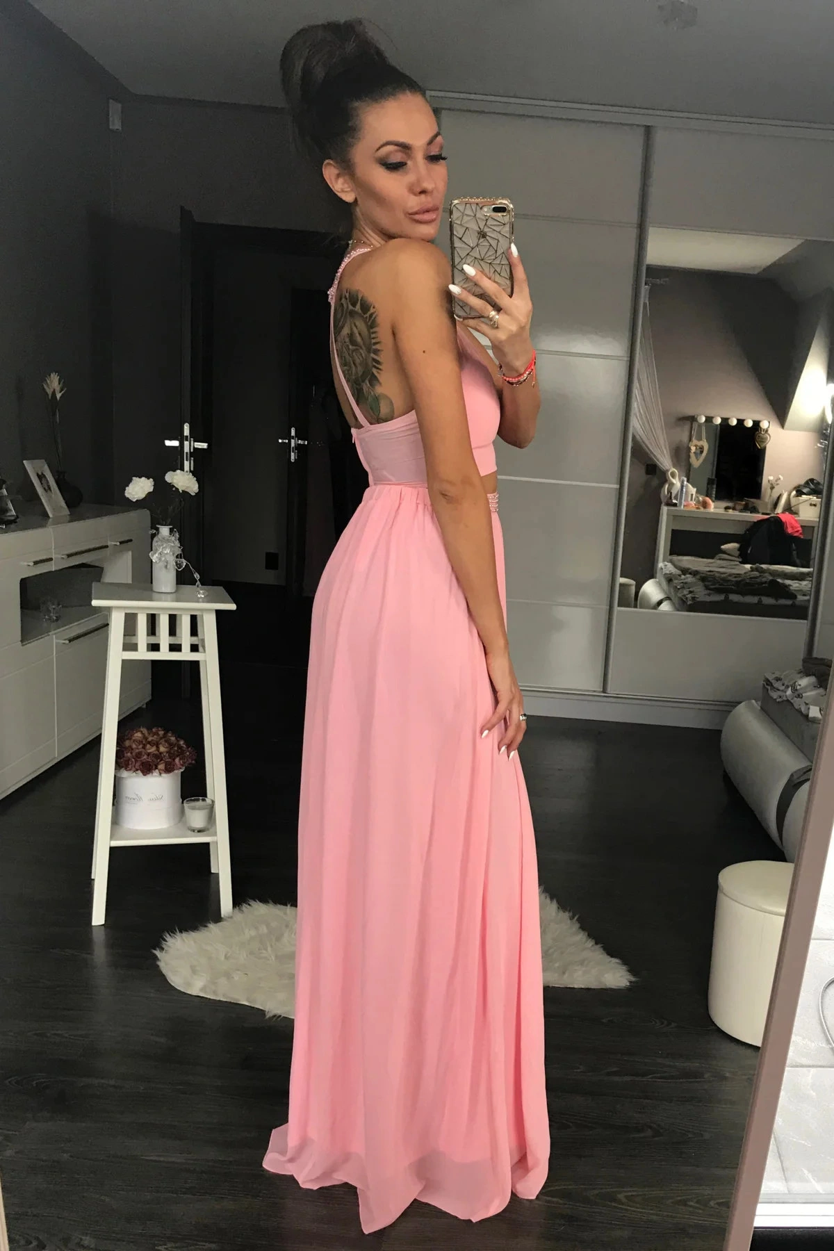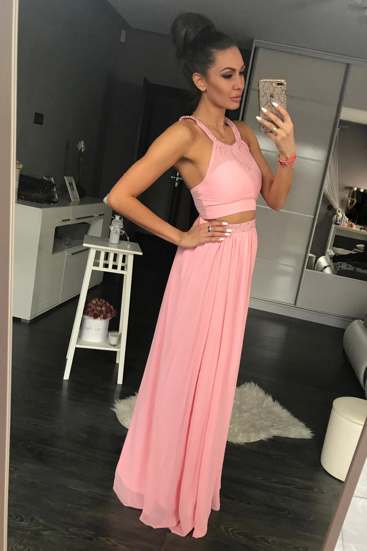 Společenské a plesové šaty dlouhé šaty. Tyto šaty se skládají z vrchního dílu a dlouhé sukně. Lem vrchního dílu a horní lem sukně je posetý perličkami v bílé a růžové barvě. Vrchní díl má všité zapínaní na zádech, dlouhá sukně má v zadní části gumu. Velmi zajímavé spojení vrchního dílu a dlouhé sukně zaručuje ženskost a především i pohodlí. Šaty si můžete vzít na společenskou událost, ale i párty. Materiál, že kterého jsou šaty vyrobeny je příjemný na omak. Kvalitní dámské šaty. Dámské značkové oblečení vyrobené pro EU.