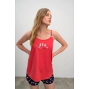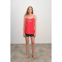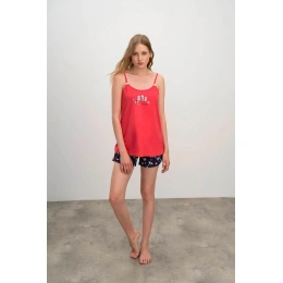 Dvoudílné dámské pyžamo pro pohodlný spánek. Komplet sestává z jednobarevné košilky na ramínka s kulatým výstřihem, který dopňují krátké šortky s potiskem domečků s pohodlnou gumou v pase. Pyžamo je vyrobené z vysoce kvalitní, genetický nemodifikované řecké bavlny, která poskytuje vysoké pohodlí, příjemný pocit na dotek, prodyšnost, pružnost a odolnost.