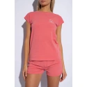 S potěšením vám představujeme dvoudílný pyžamový komplet z kolekce "Sustainability" značky Emporio Armani, který je ztělesněním elegance a pohodlí. Tato nádherná souprava, která se skládá z trička s krátkým rukávem a šortek, je určena pro ženy, které si cení vysoké kvality a jemné estetiky.