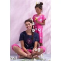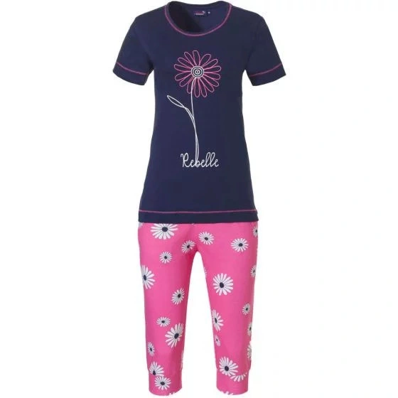 Dámské pyžamo od Rebelle s krátkým rukávem. Na tmavě modrém vršku je obrázek sedmikrásky a text - Rebelle -. Polodlouhé pyžamové kalhoty jsou růžové barvy s potiskem kopretin.