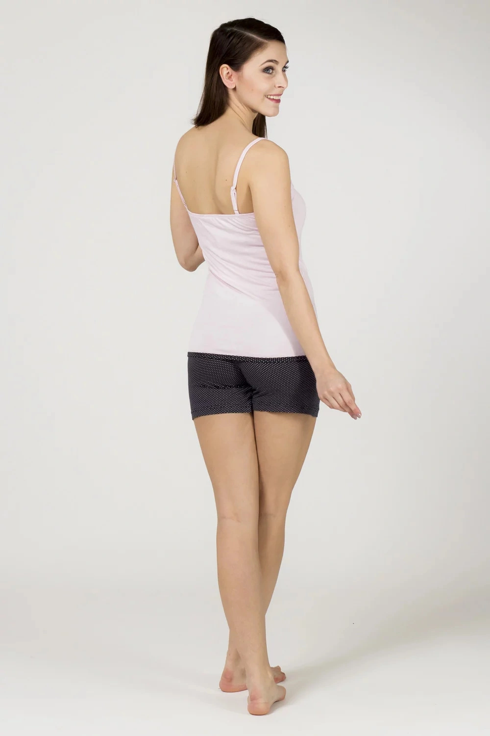 Dámské pyžamo na ramínkách, s krátkými šortkami. Ušité z 94% viskozy a 6% elastanu.