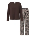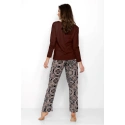 Dámský pyžamový set, který kombinuje eleganci s pohodlím. Tričko s dlouhým rukávem a polokruhovým výstřihem v subtilní ženské stylu se skvěle hodí nejen jako spánek, ale také jako stylový domácí oděv. Vyrobeno z měkkého, prodyšného materiálu s květovanou strukturou, poskytuje pohodlí po celý den. Kalhoty s dlouhými nohavicemi a volným, pohodlným střihem jsou ideálním doplňkem setu. Díky elastickému pásku v pase se přizpůsobí postavě a nabídnou volnost pohybu. Pyžamo se vyznačuje decentní barevností a vysokou kvalitou materiálu, což mu dodává elegantní vzhled. Je to skvělá volba pro ženy, které ocení pohodlí a styl v domácím prostředí. Složení: Top: 92% bavlna, 8% elastan Dolní část: 100% viskóza