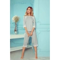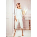Kalhoty s nohavicemi ve 3/4 délce jsou olemované krajkou. Také rukávy ve 3/4 délce lemuje krajka. Výstřih blůzy pyžama je lodičkový. Pyžamo je k dostání v pěti barevných variantách.