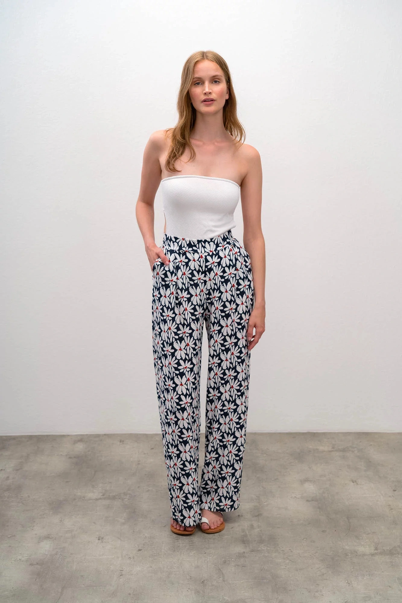 Elegantní kalhoty s vysokým pasem a barevnými a zajímavými potisky. Kalhoty se zipem na boku. Kalhot