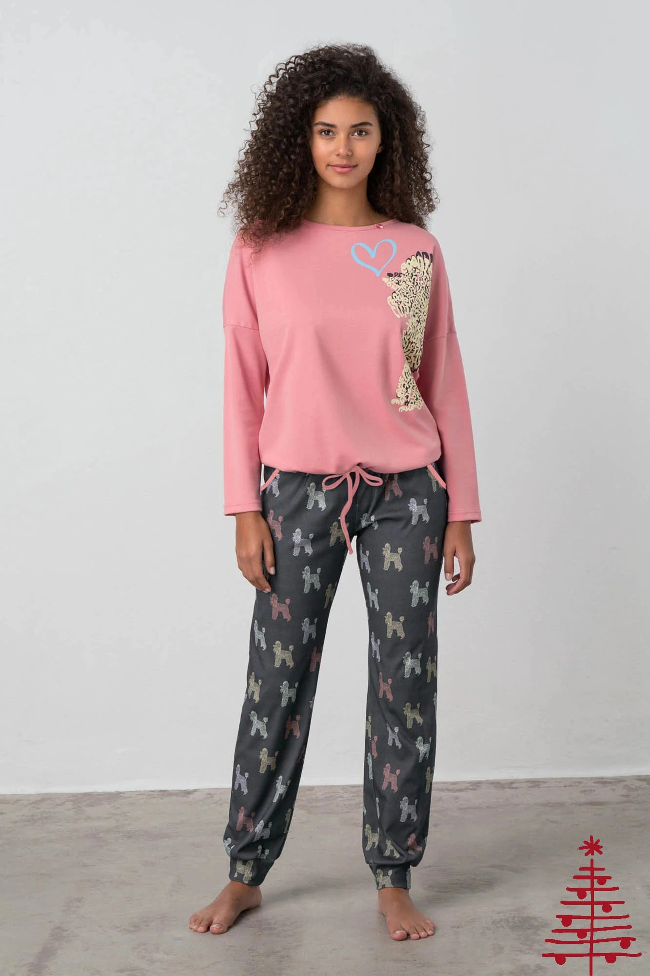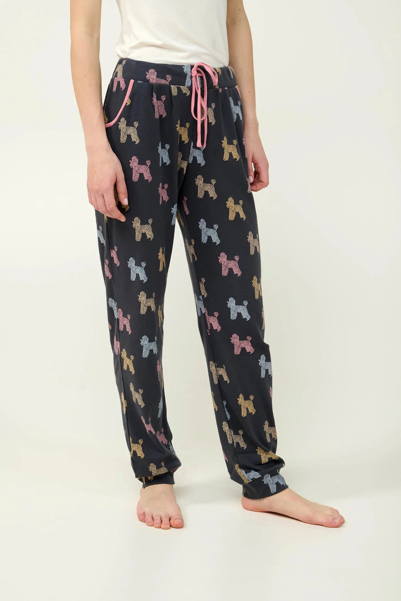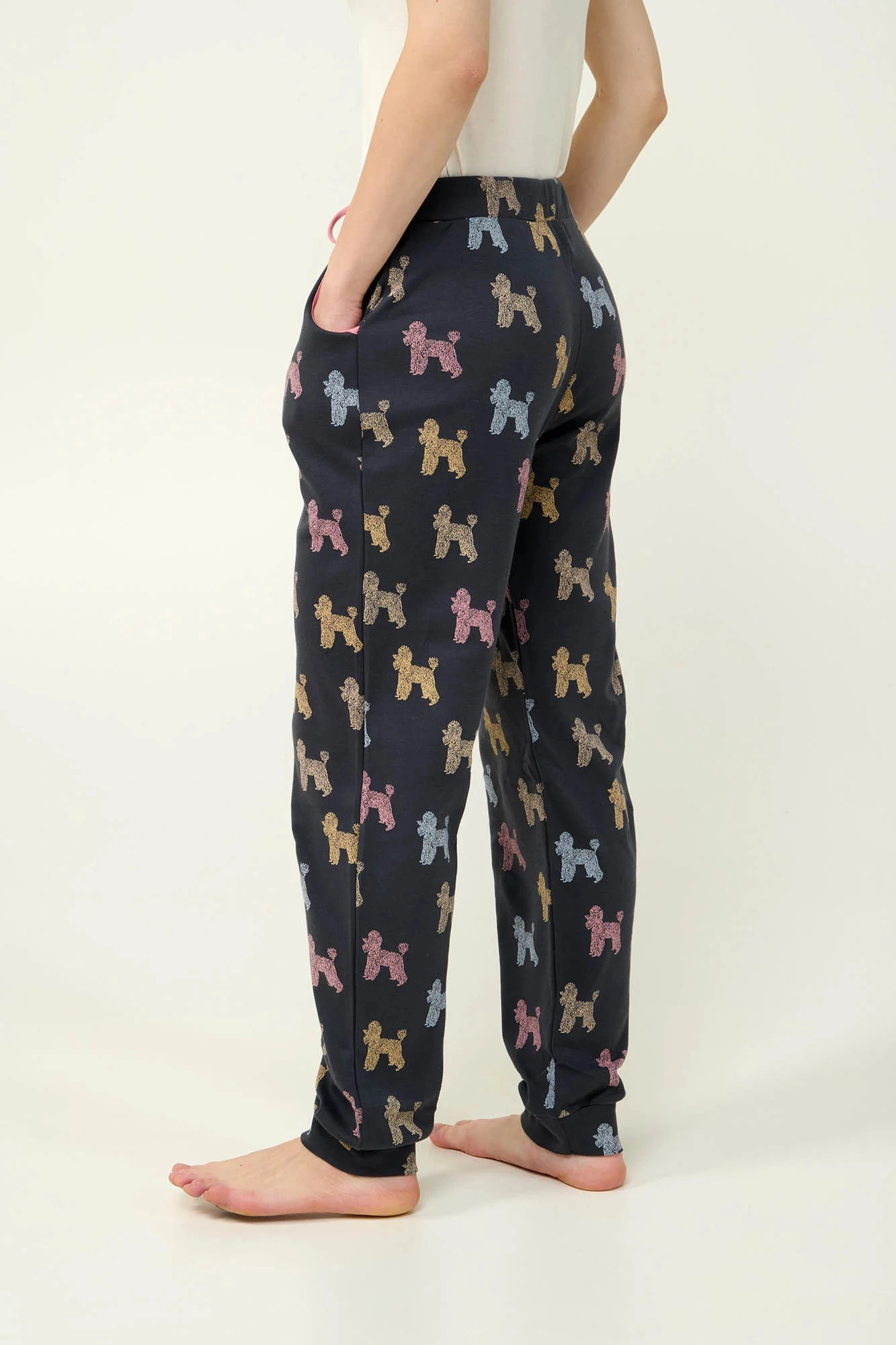 Dámské stylové pyžamové kalhoty s úžasným potiskem pudlů a šňůrkou v pase, které si prostě hned zamilujete! Kalhoty jsou vyrobené z vysoce kvalitní přírodní egejské bavlny, která poskytuje vysoké pohodlí, příjemný pocit na dotek, prodyšnost, pružnost a odolnost.