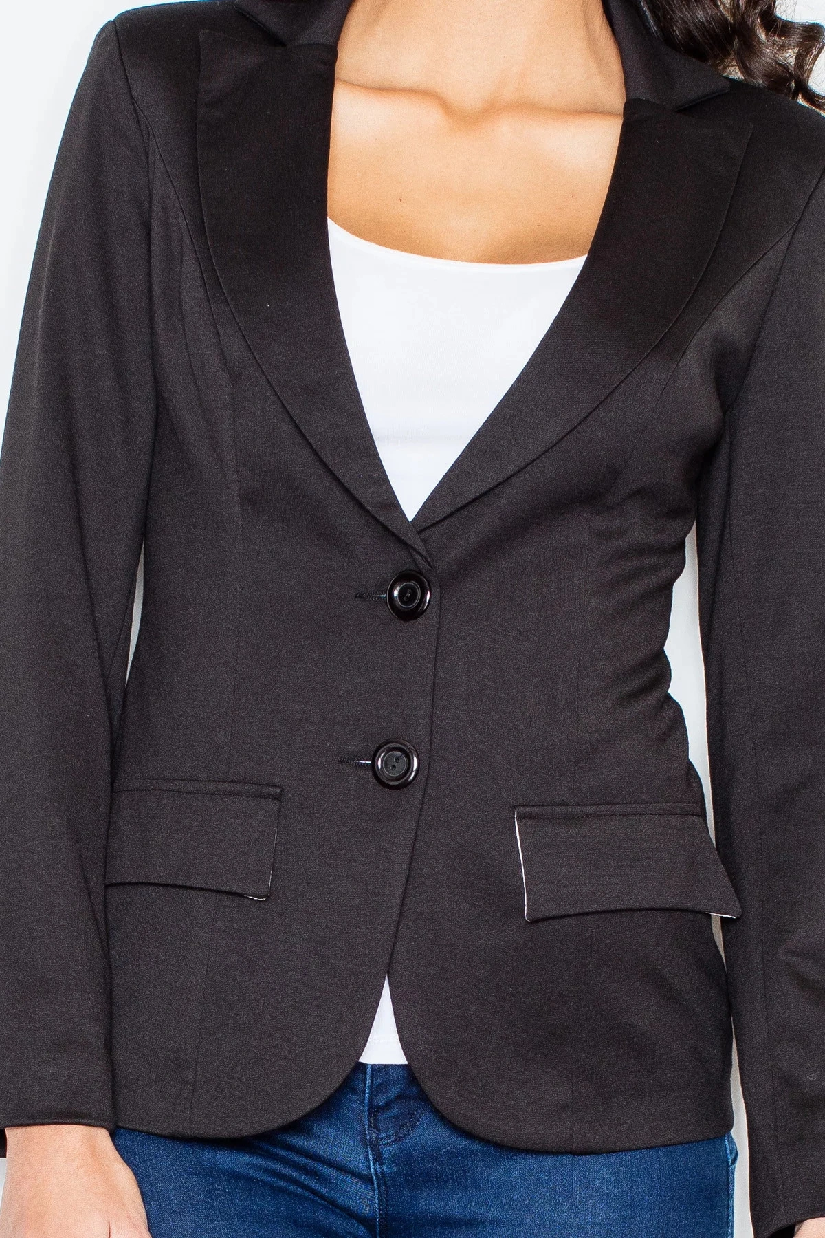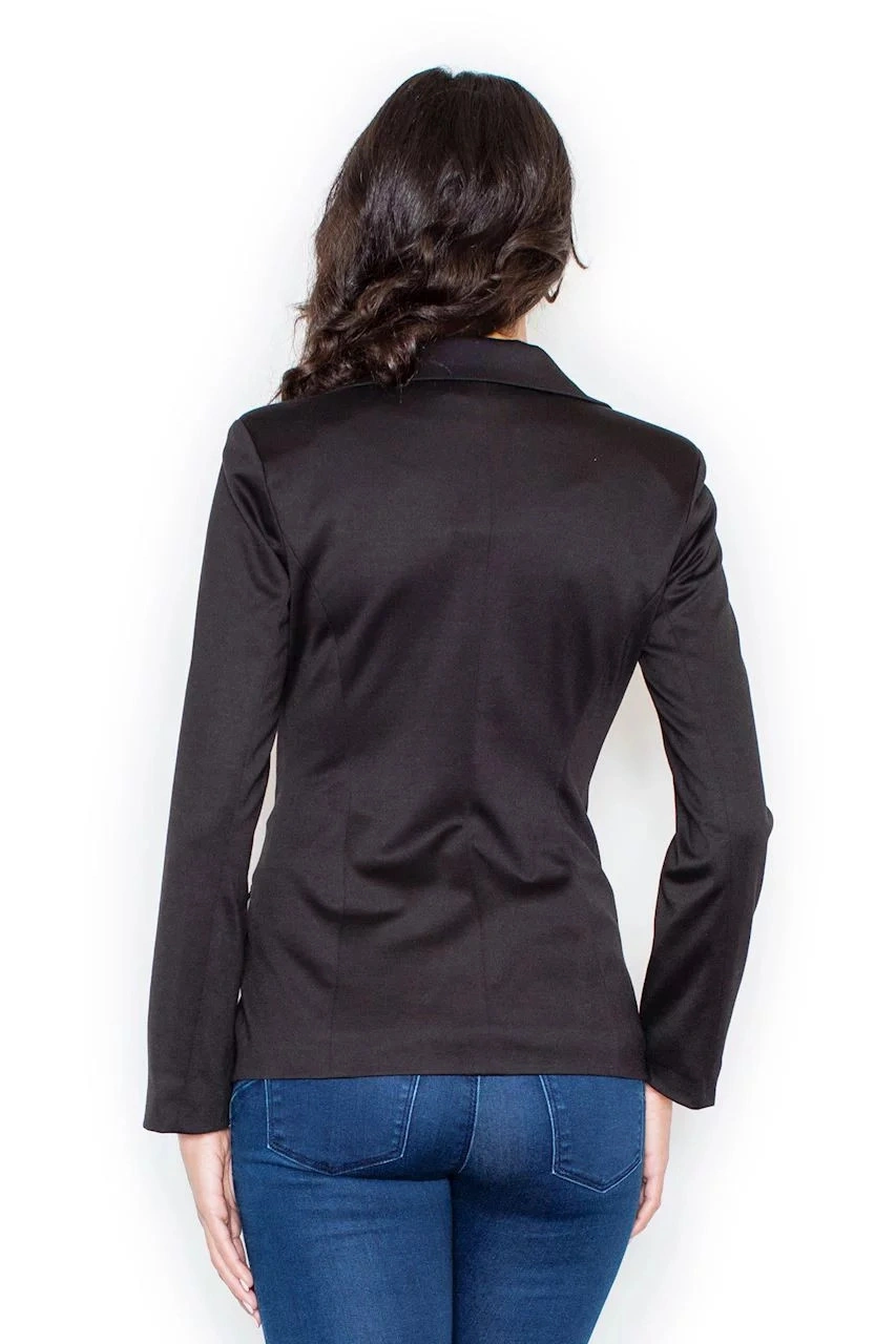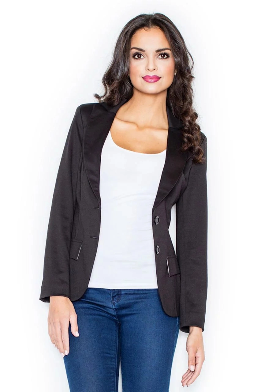 Dámské měkké sako s dlouhým rukávem, délka přes boky. Podšité. Zapínání na dva knoflíky. Na předním díle našité klopy - imitace kapes.