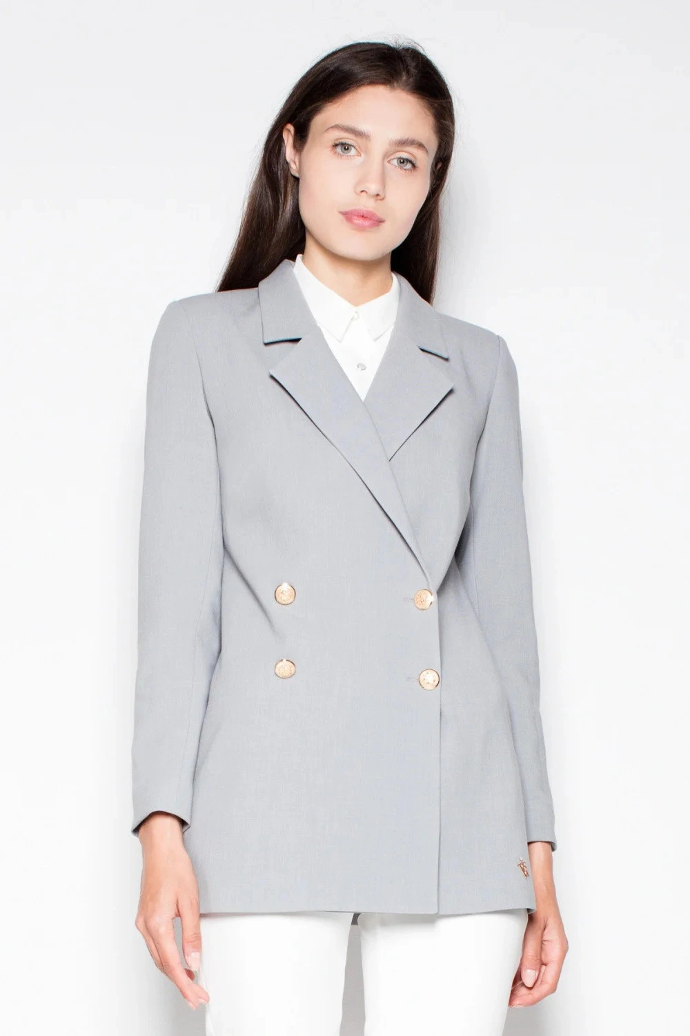 Skromné, ale velmi elegantní dvouřadové sako s dlouhými rukávy a zapínáním na knoflíky. Ozdobné knoflíky na rukávech, dokonale padnoucí na tělo.
