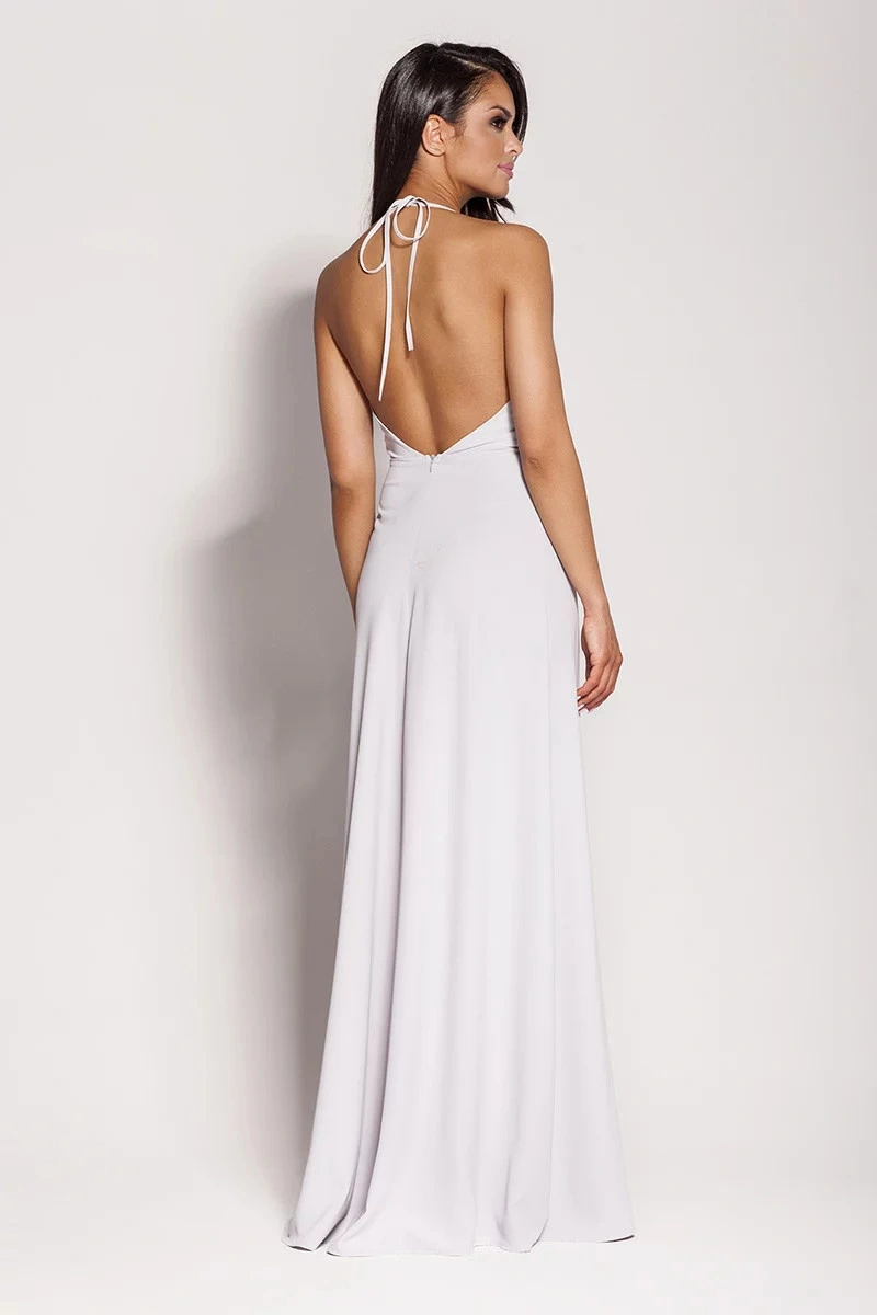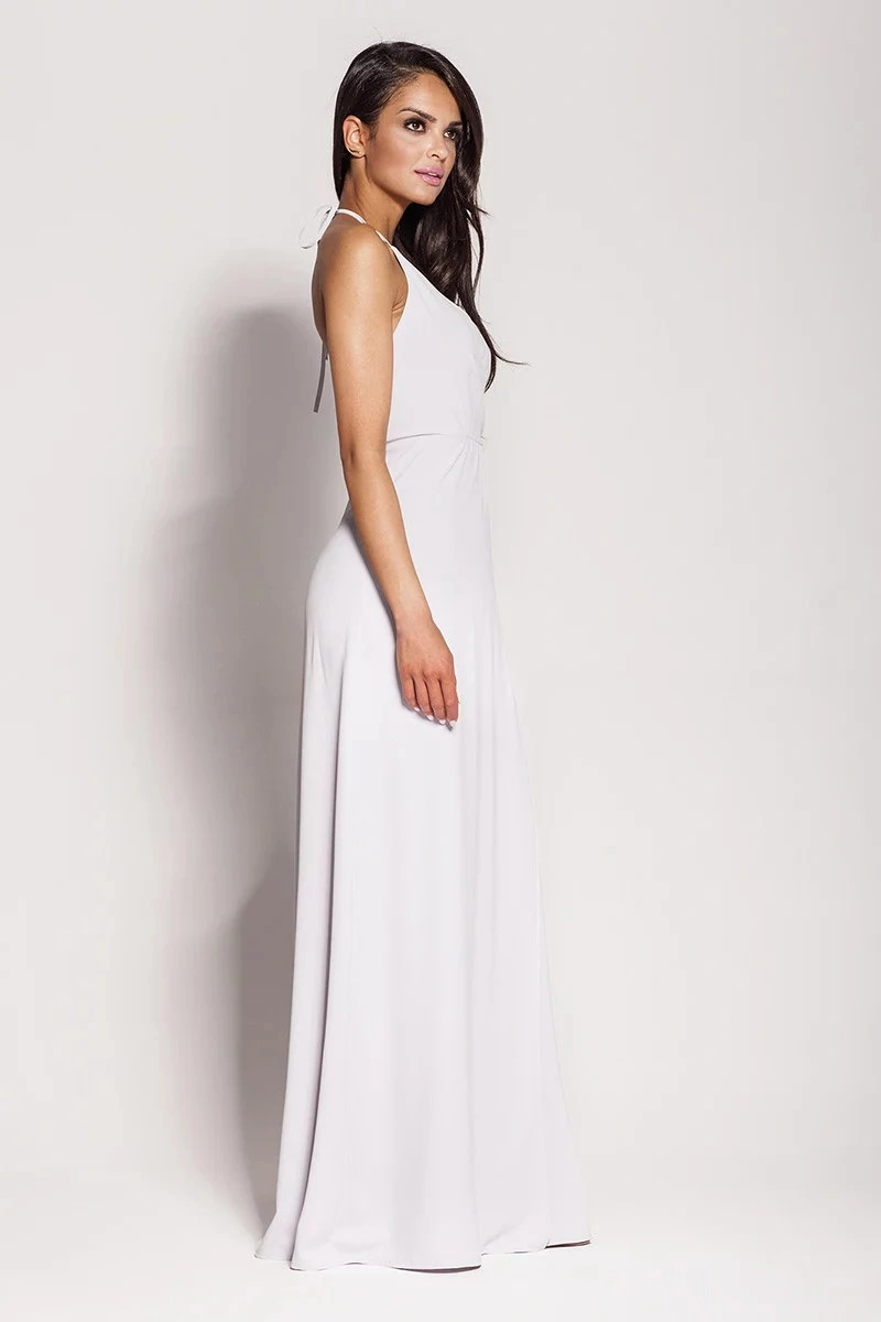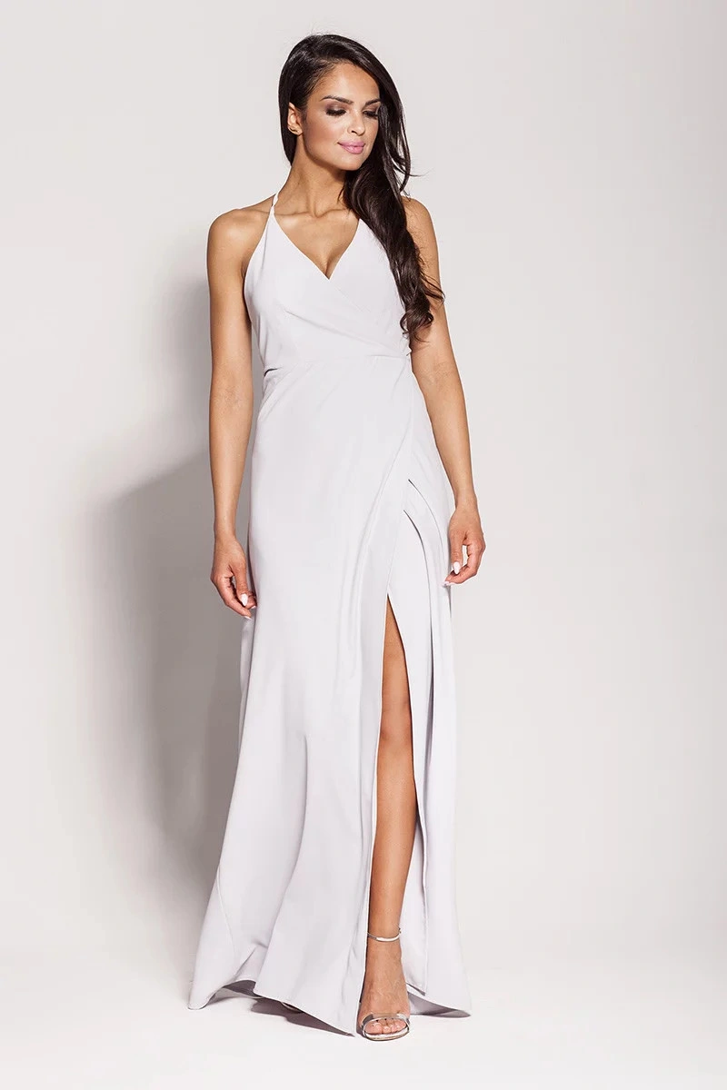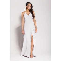 Velmi ženské šaty s výstřihem na ramínka. Díky dlouhé siluetě a vysokému rozparku vpředu se budete c