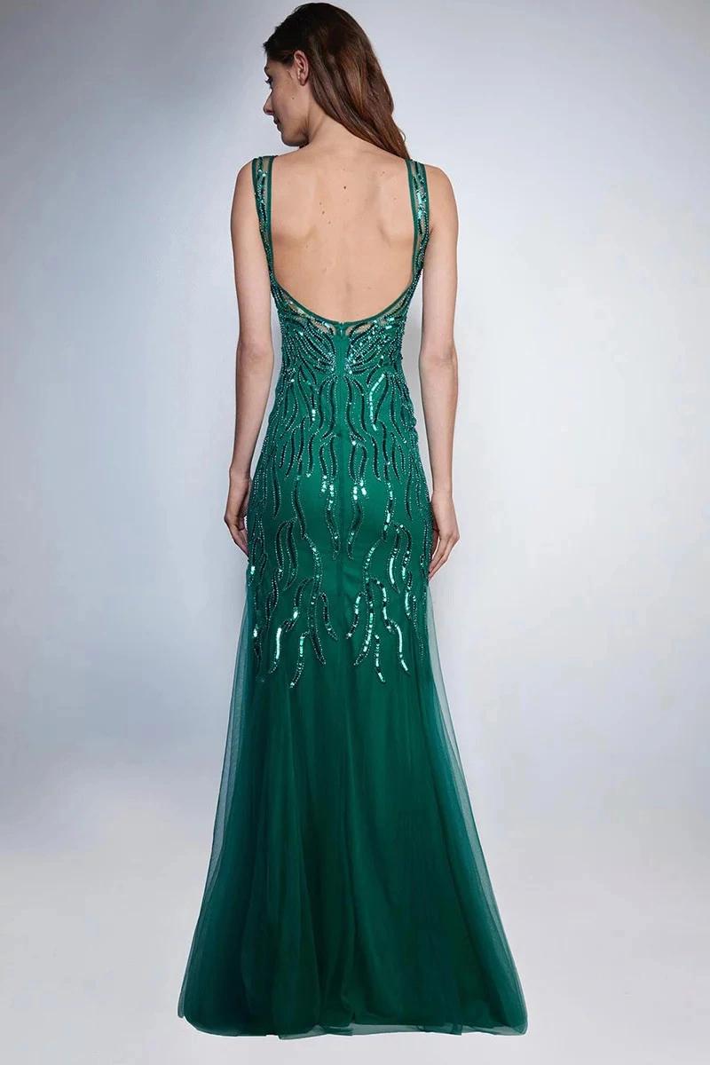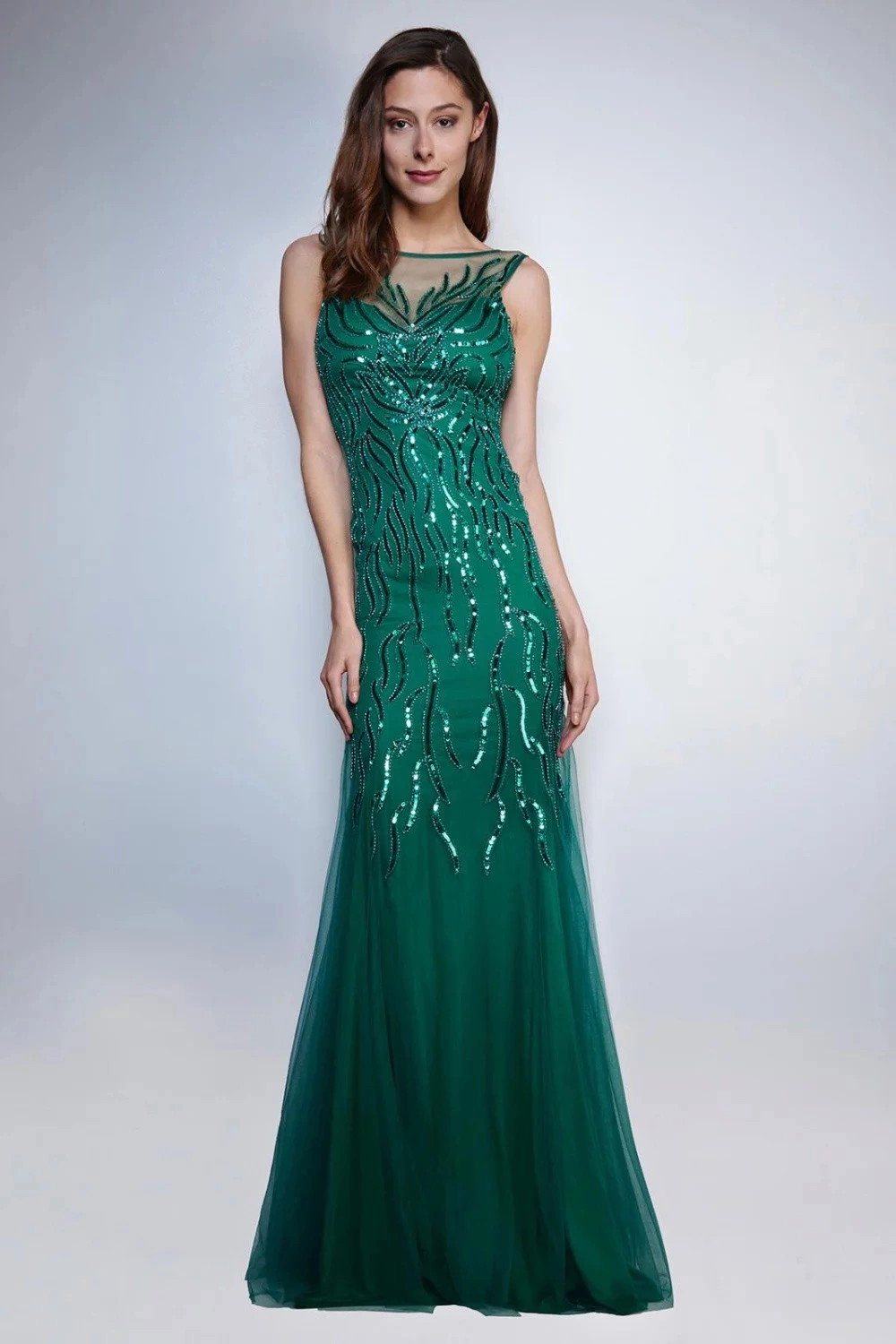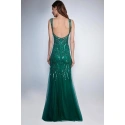 Krásné večerní šaty s dlouhými rukávy a kulatým výstřihem. Horní polovinu šatů překrývá krajka. Bočn