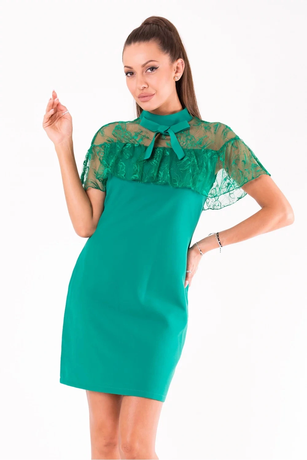 Elegantní, ale jednoduché šaty s ozdobnou krajkou na ramenou. Ozdobný volán ve výstřihu.