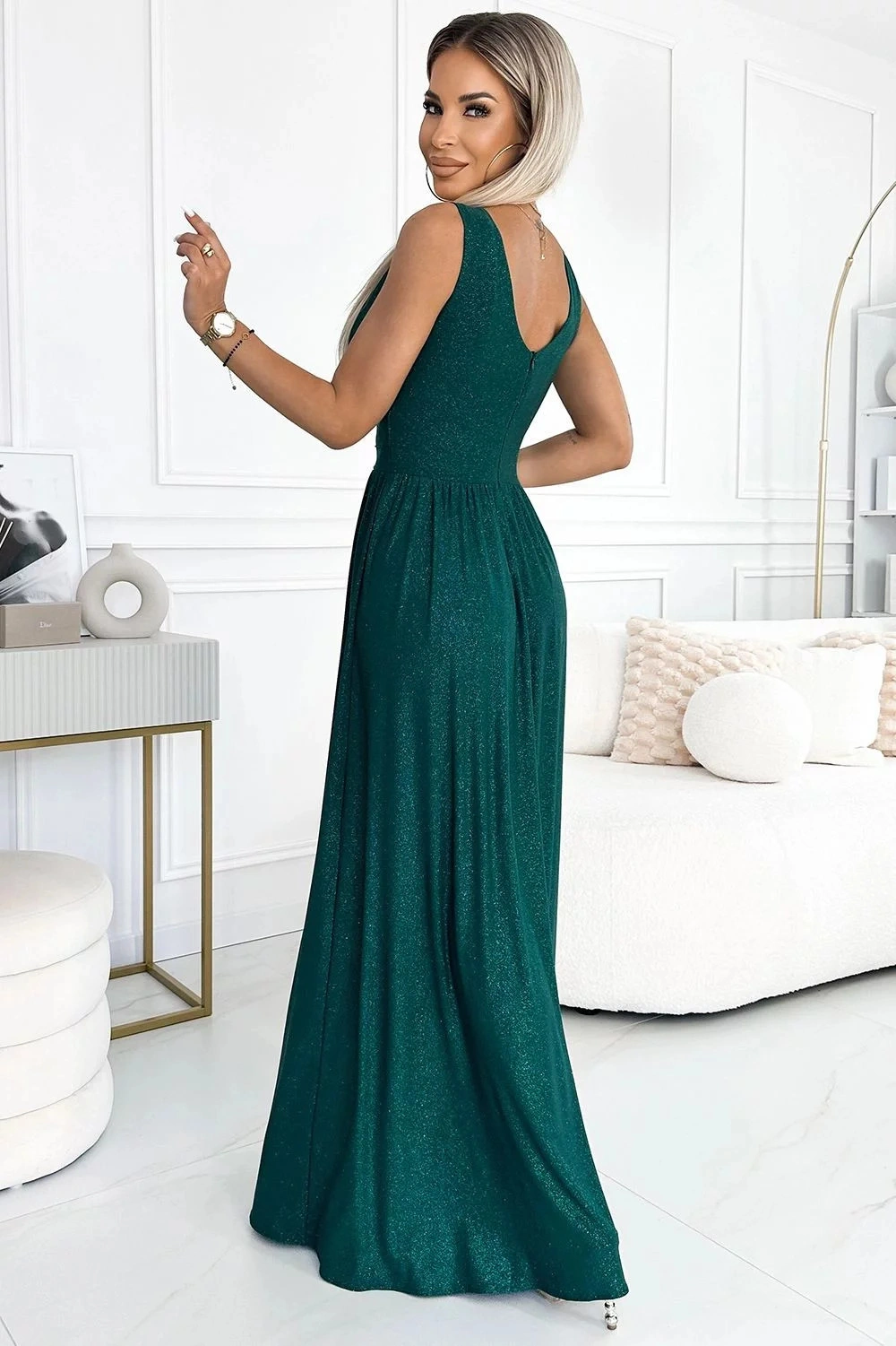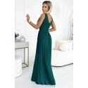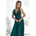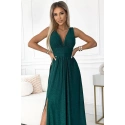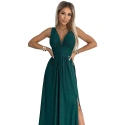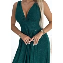 Dámské šaty 490-3 SUSAN NUMOCO - zelená barva - otevřený výstřih - prošívání v pase - rozparek - elastický materiál se třpytkami - ideální na svatby, plesyMateriálové složení: 95% polyester + 5% elastan
