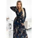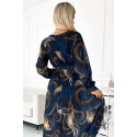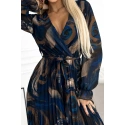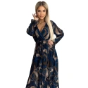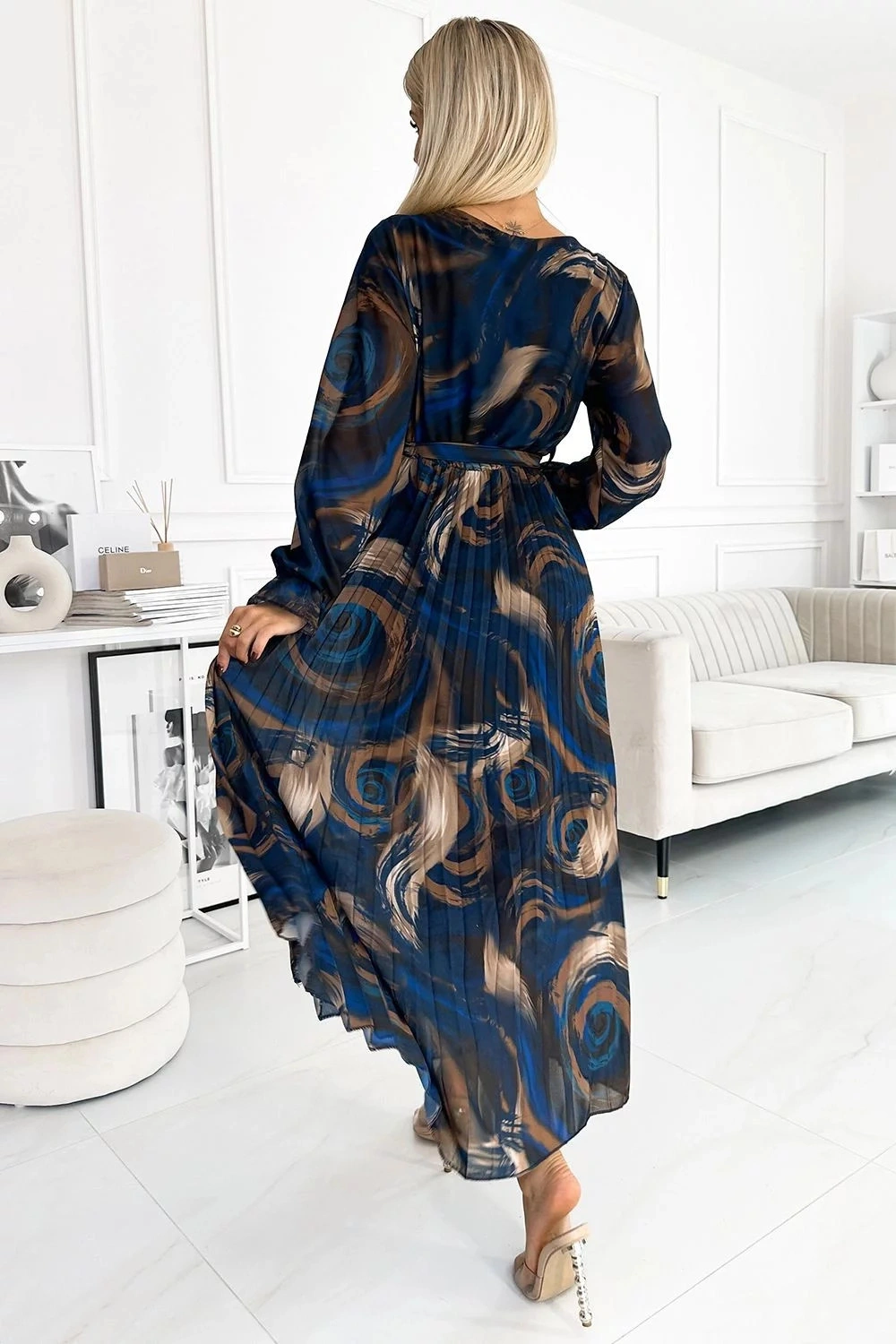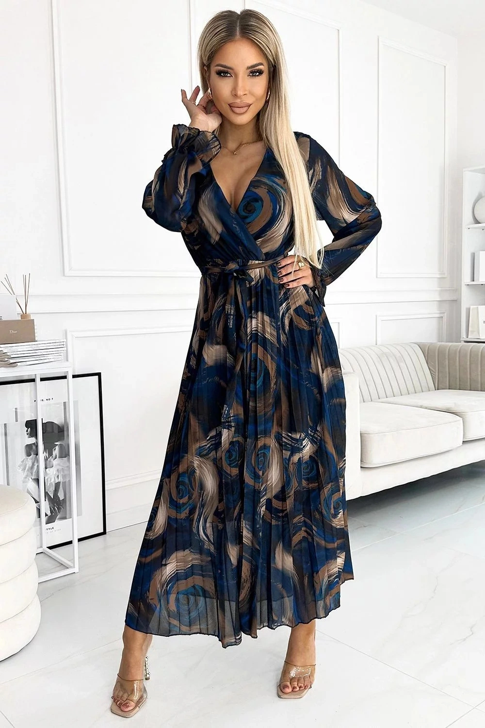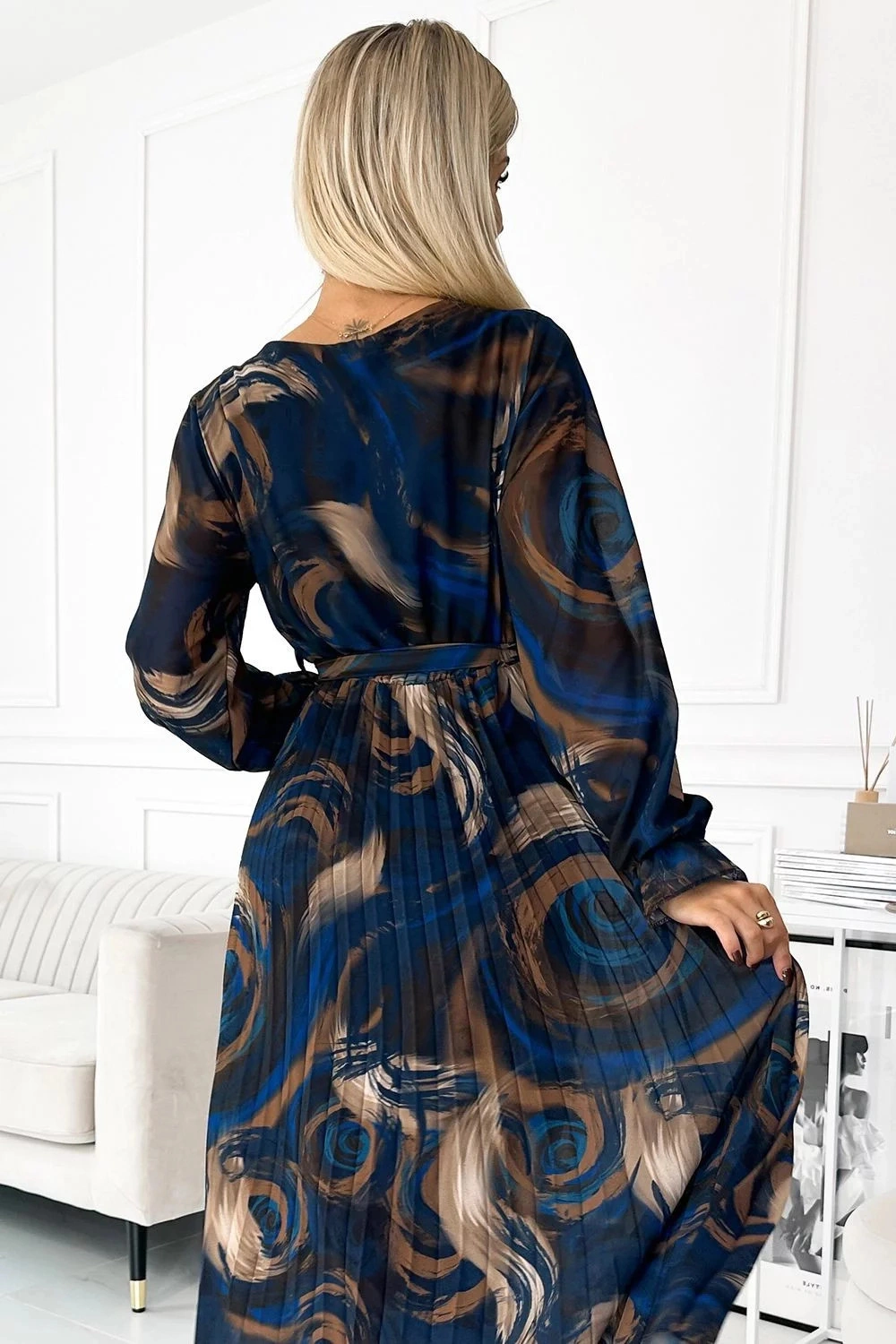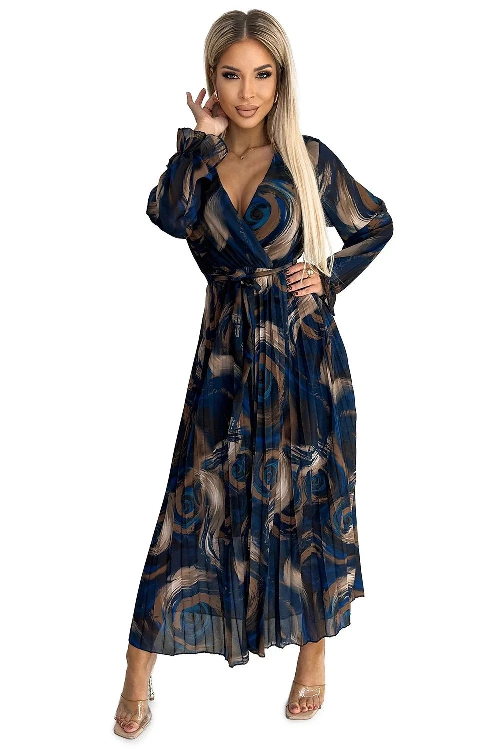 Dámské šaty 519-1 Numoco basic - modrá barva - ze šifónového materiálu s podšívkou - se vzorem béžových vln - dlouhé plisované šaty - psaníčkový výstřih - dlouhé rukávy - pásek na zavazováníMateriálové složení: 95% polyester + 5% elastan