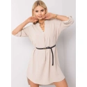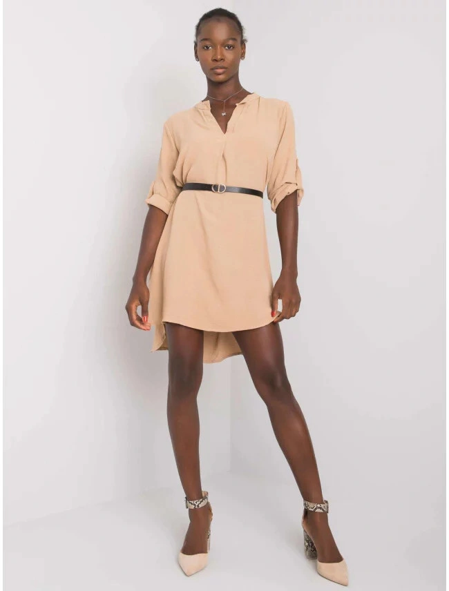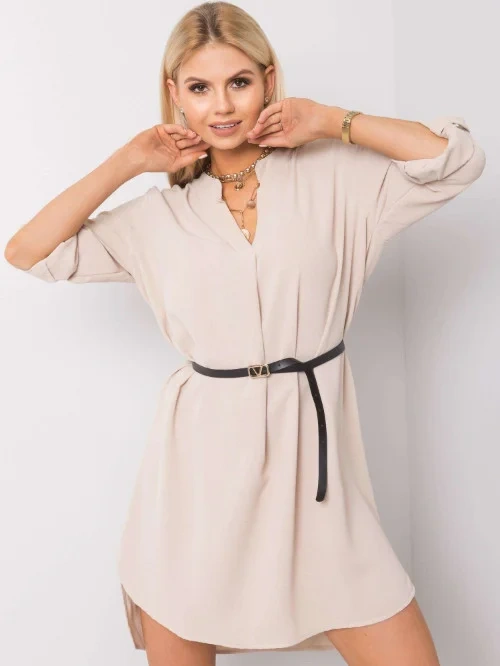 Trendy košilové šaty/tunika s výstřihem do V a manžetami na rukávech. Součástí výrobku je úzký černý pásek. Asymetrický lem vzadu delší. Nepružný a vlnitý materiál.