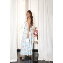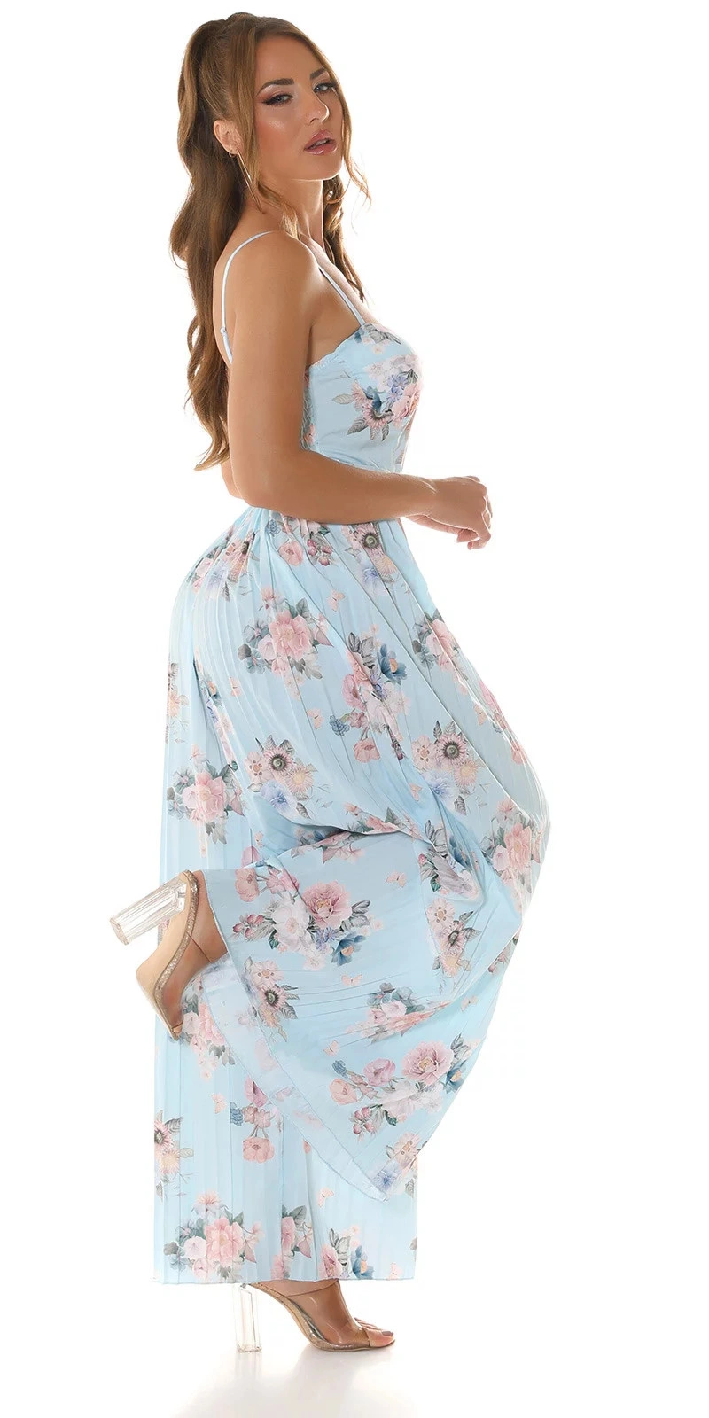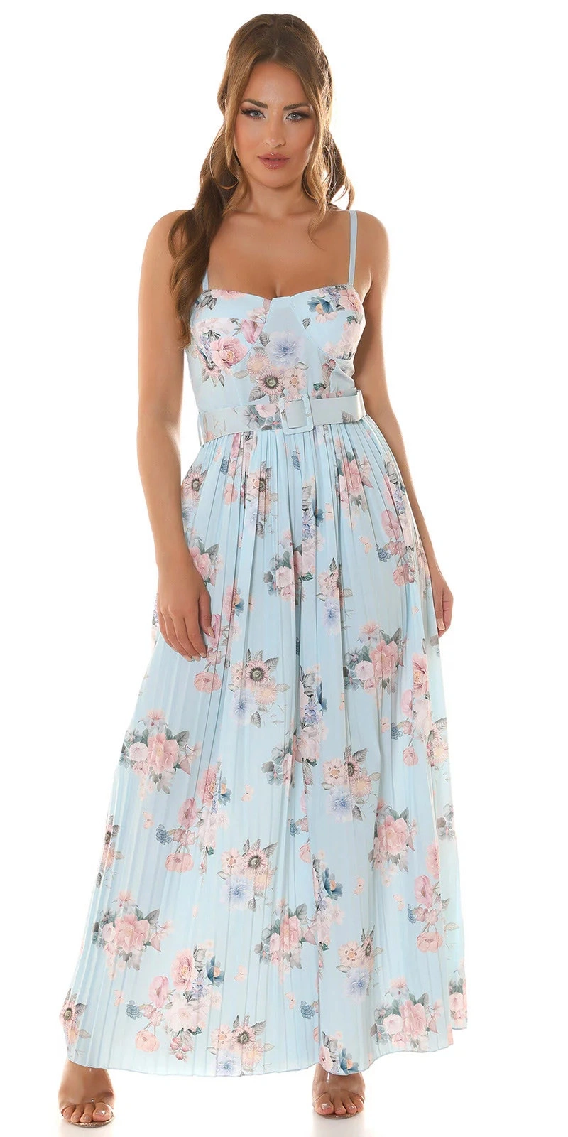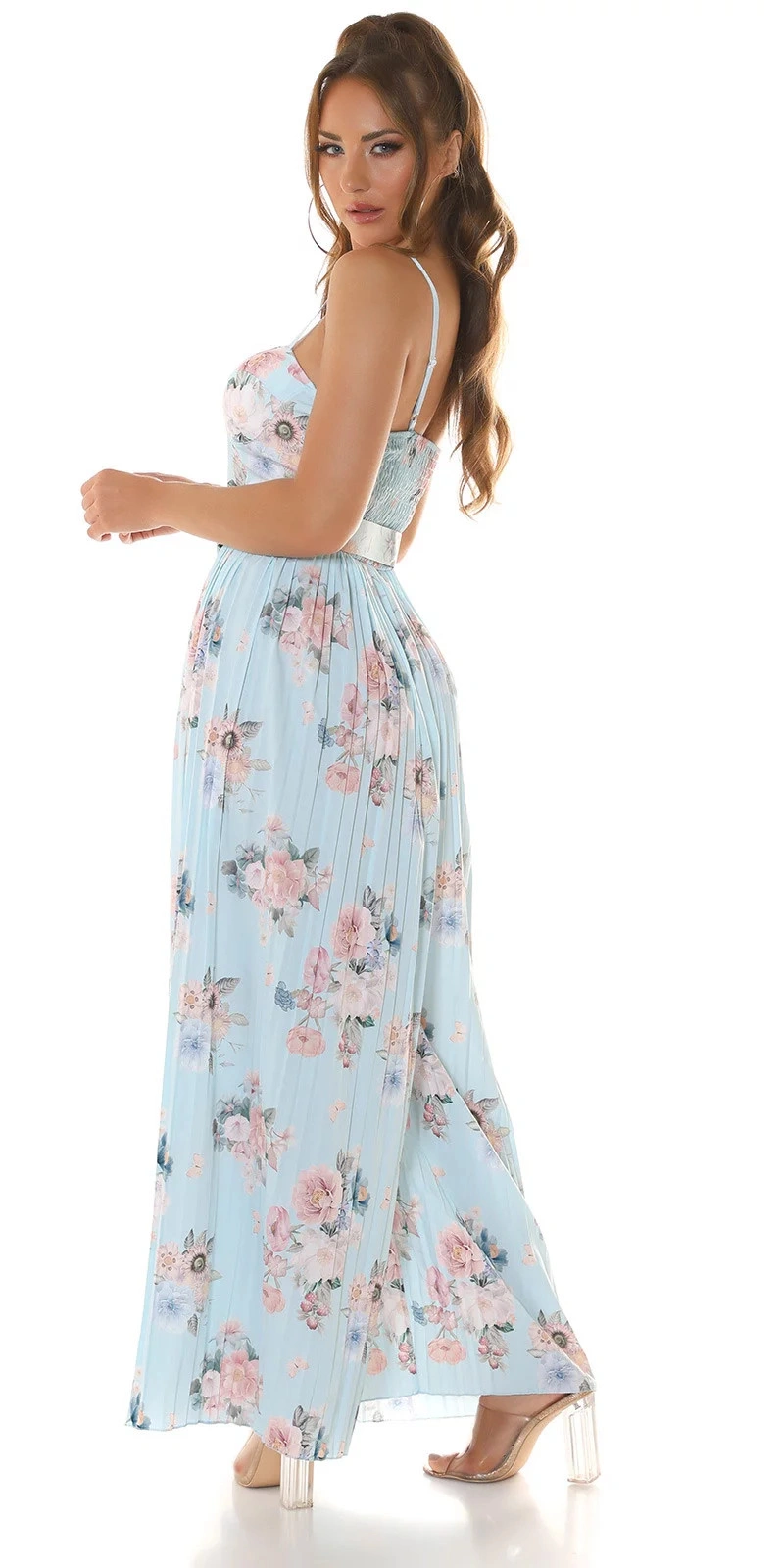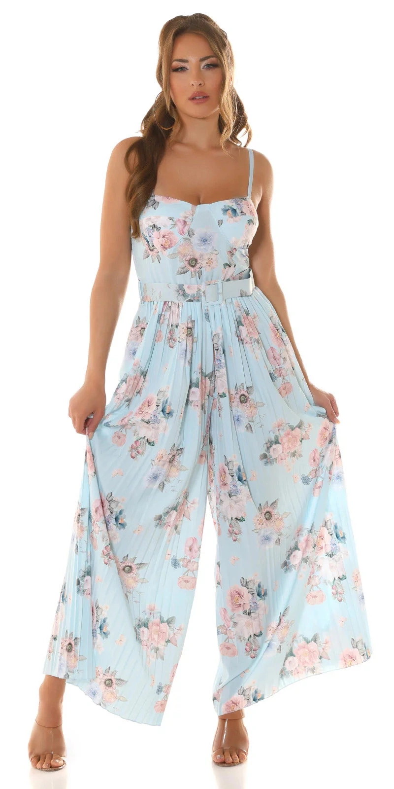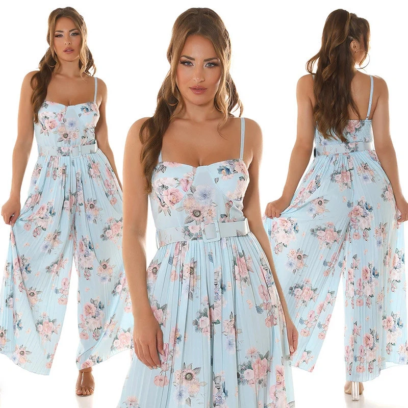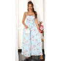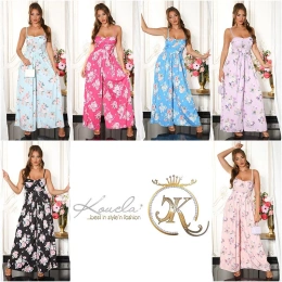 Dlouhé dámské šaty se skládanou sukňovými kalhoty. Pásek je součástí balení. Podprsenka vyztužená, bez kostic.