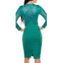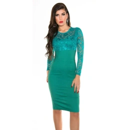 Krásné večerní šaty s dlouhými rukávy a kulatým výstřihem. Horní polovinu šatů překrývá krajka. Boční zipové zapínání.