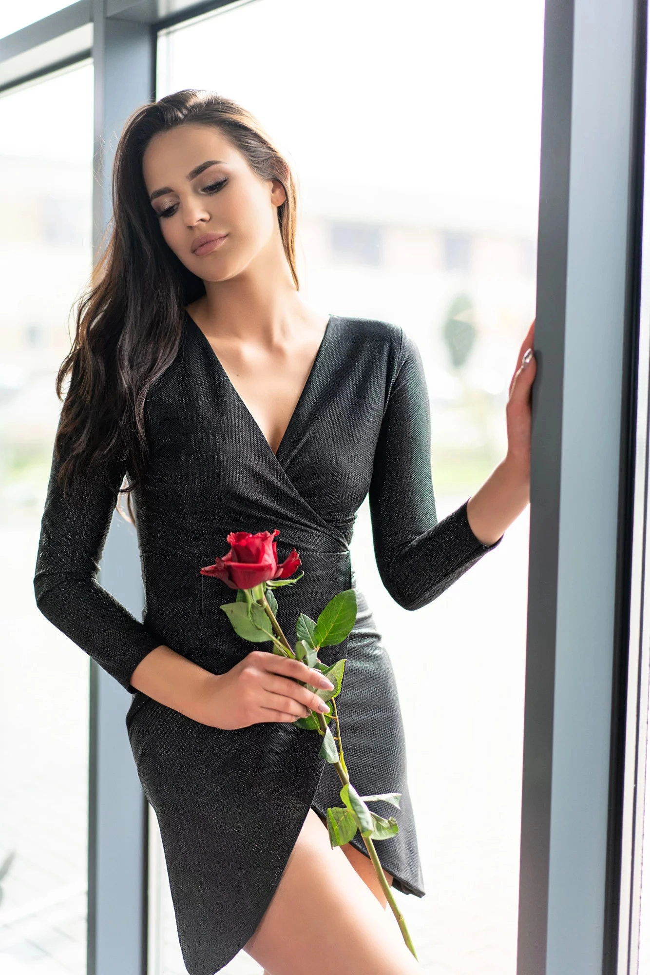 Přiléhavé šaty ideální pro zvláštní příležitosti, vyrobené z měkkého, pružného úpletu. Sexy střih zajišťuje obálkový výstřih a délka, která odvážně odhaluje stehna. Černá, intenzivní barva. Materiálové složení: 95% polyester, 5% elastan