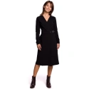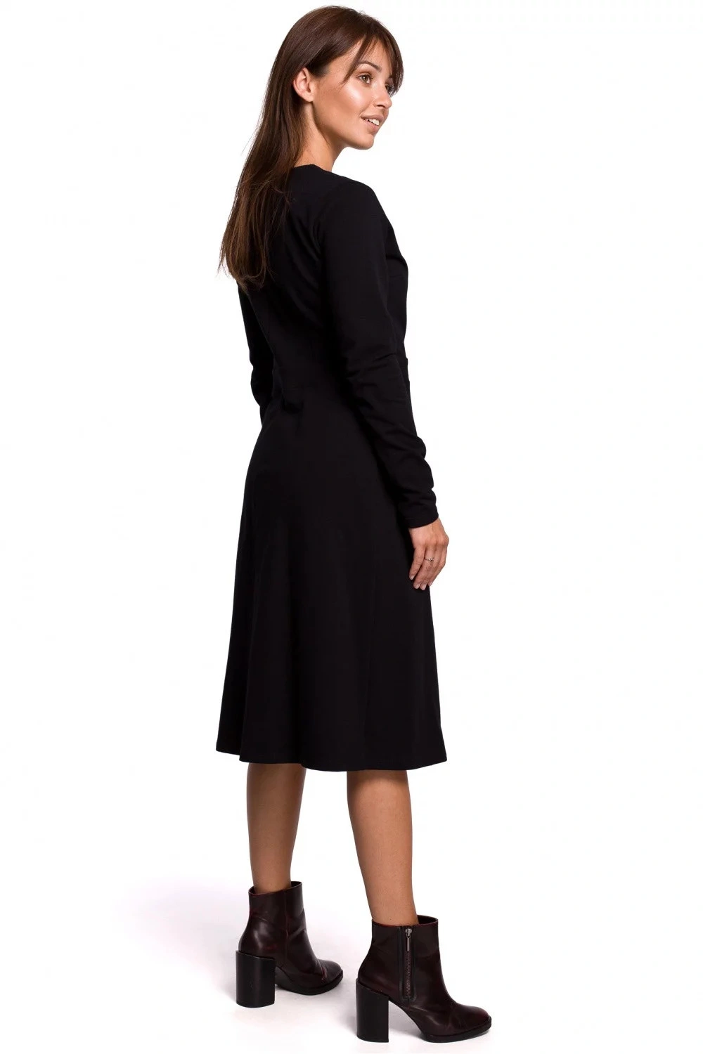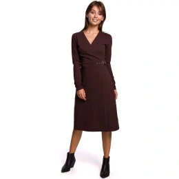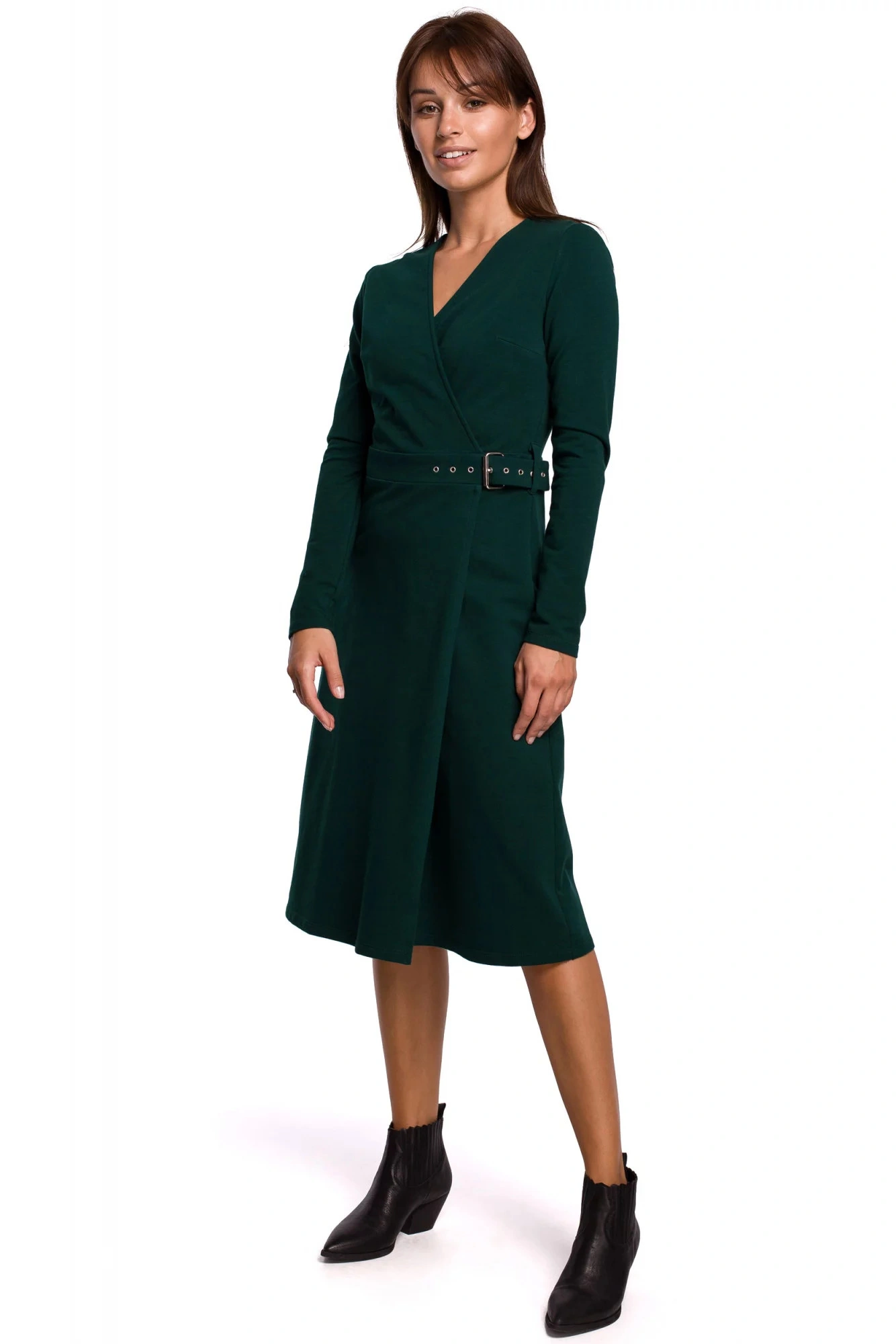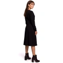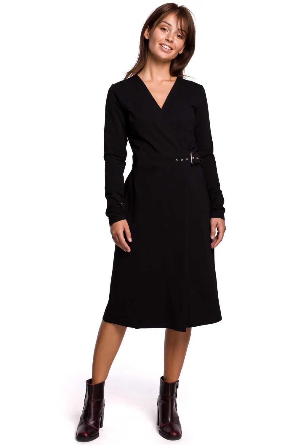 Šaty s dlouhými rukávy z hřejivého bavlněného úpletu jsou ideální volbou pro chladnější dny. Jednoduchý trapézový střih s překrytým výstřihem a ozdobným páskem se sponou na boku decentně zdůrazní ženskou siluetu. Šaty jsou bez podšívky.