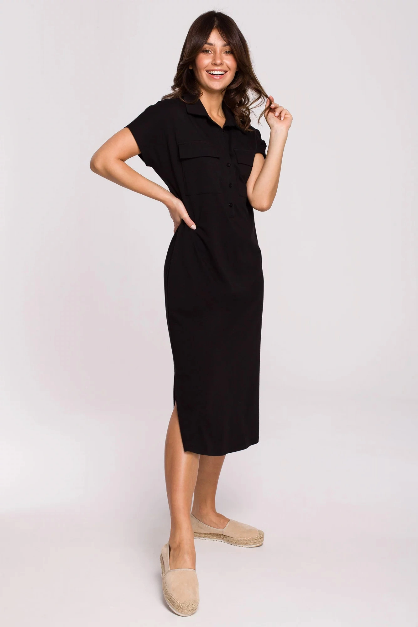 Tyto šaty mají mnoho tváří. Jednoduchá košile s límečkem a kapsami ve stylu safari na přední straně sahá do půli lýtek a má rozparky na bocích. Je volné a ležérní, ideální pro horké dny, zejména proto, že je vyrobeno z bavlny, která umožňuje pokožce dýchat. Shromážděné s páskem se v mžiku změní.