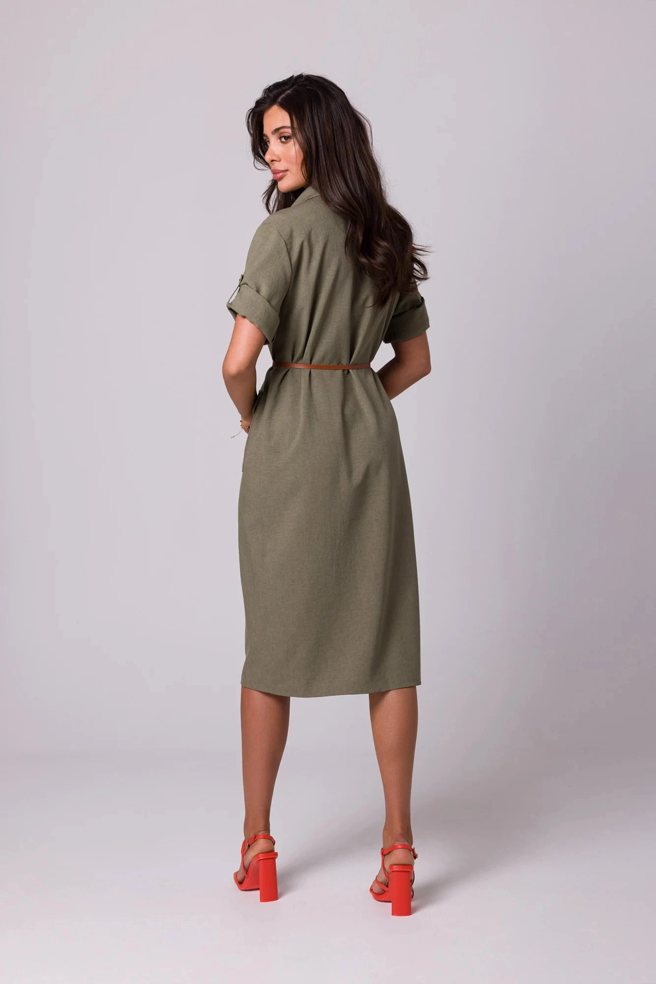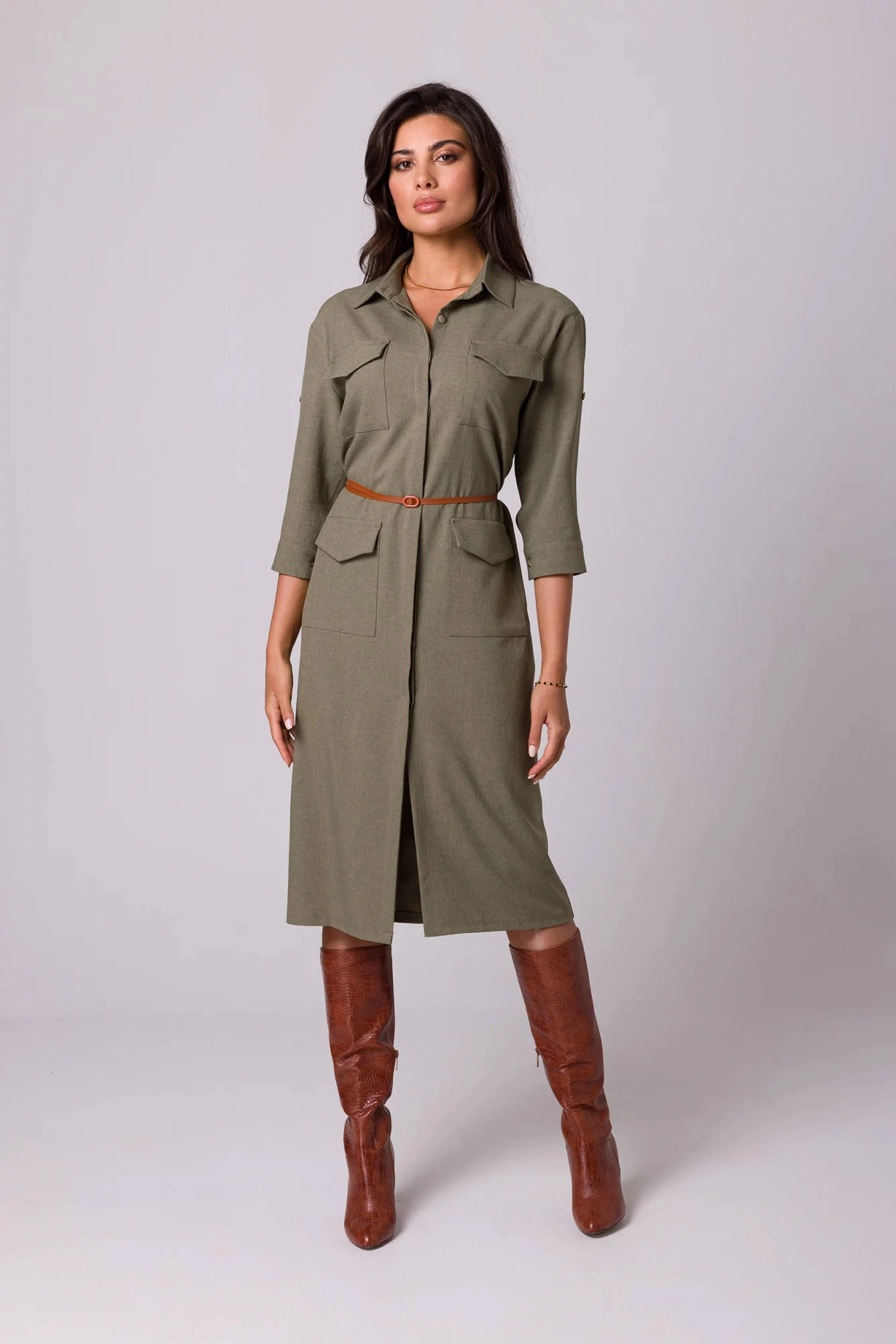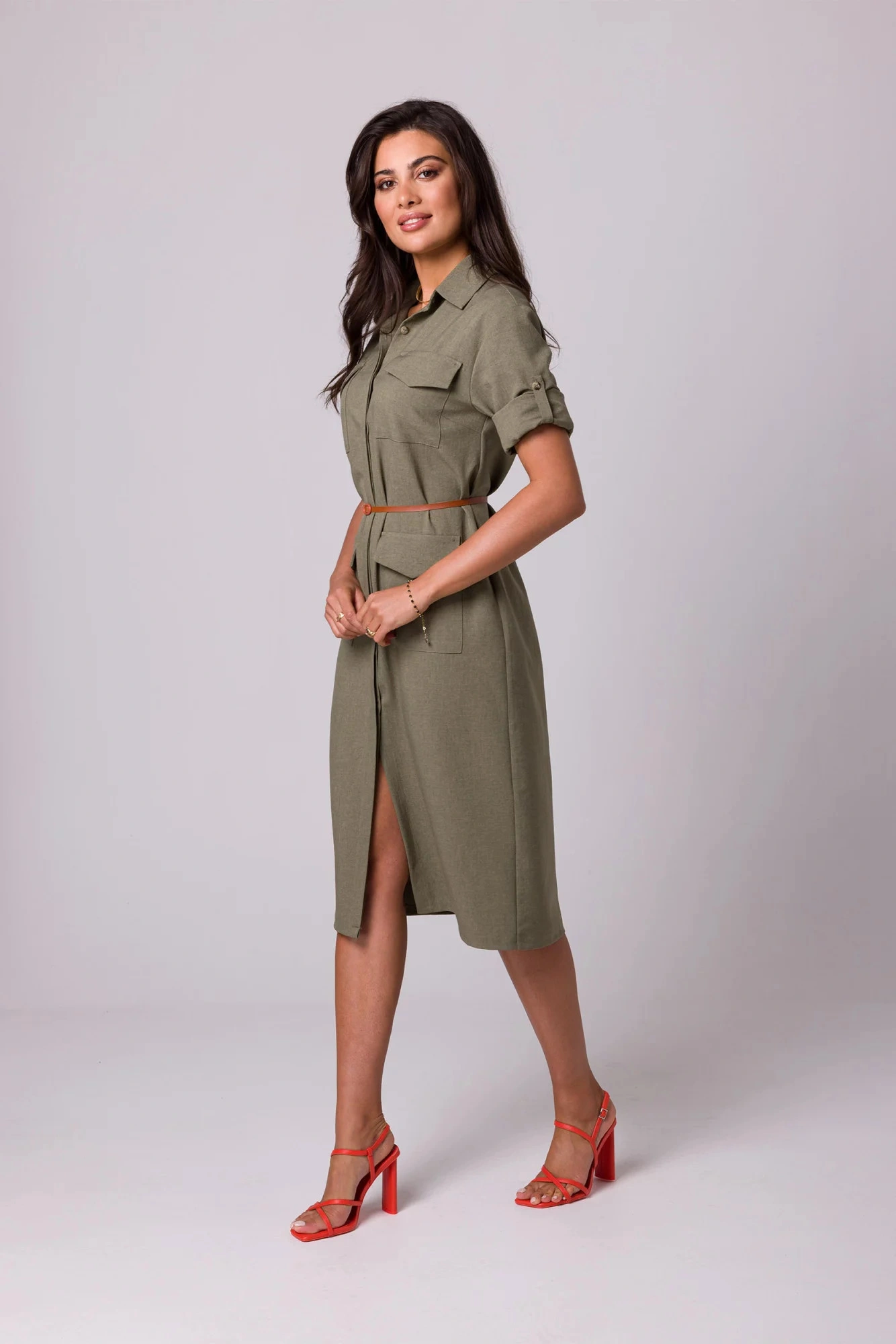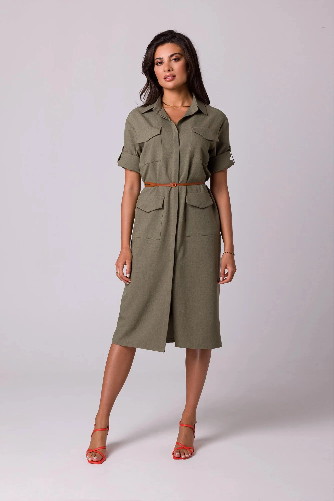 Košilový design se dvěma řadami kapes s klopami, zapínáním na knoflíky a páskem s přezkou - šaty safari typu si zamilujete v letních dnech.