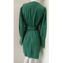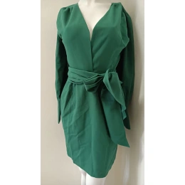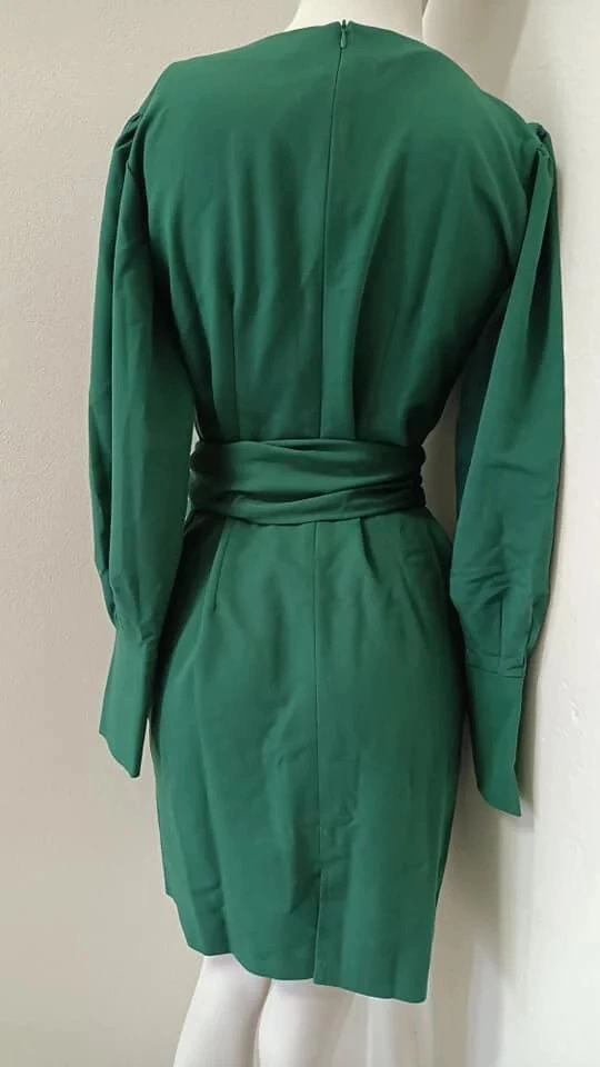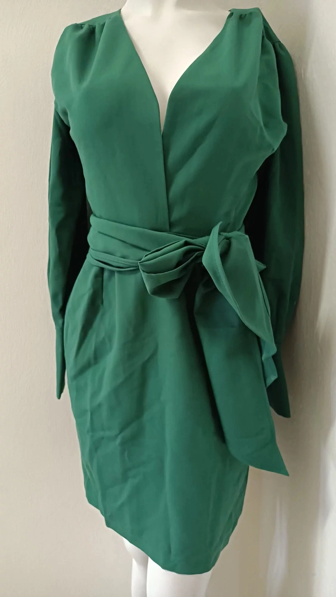 Dámské šaty ke kolenům, dlouhý rukáv ukončený širokým rantlem. Vepředu šatů hluboký výstřih. Zapínání na zádech na zip. Součástí šatů je dlouhá mašle na zavazování v pase.