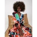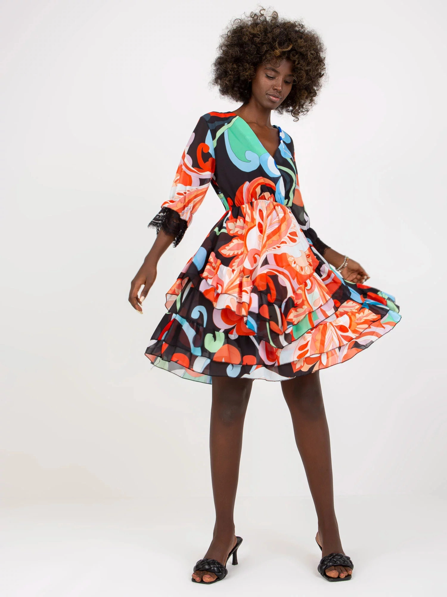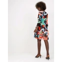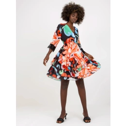 Černo-oranžové mix mini šaty s volánky a potiskem .