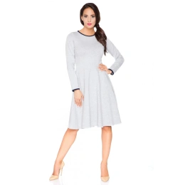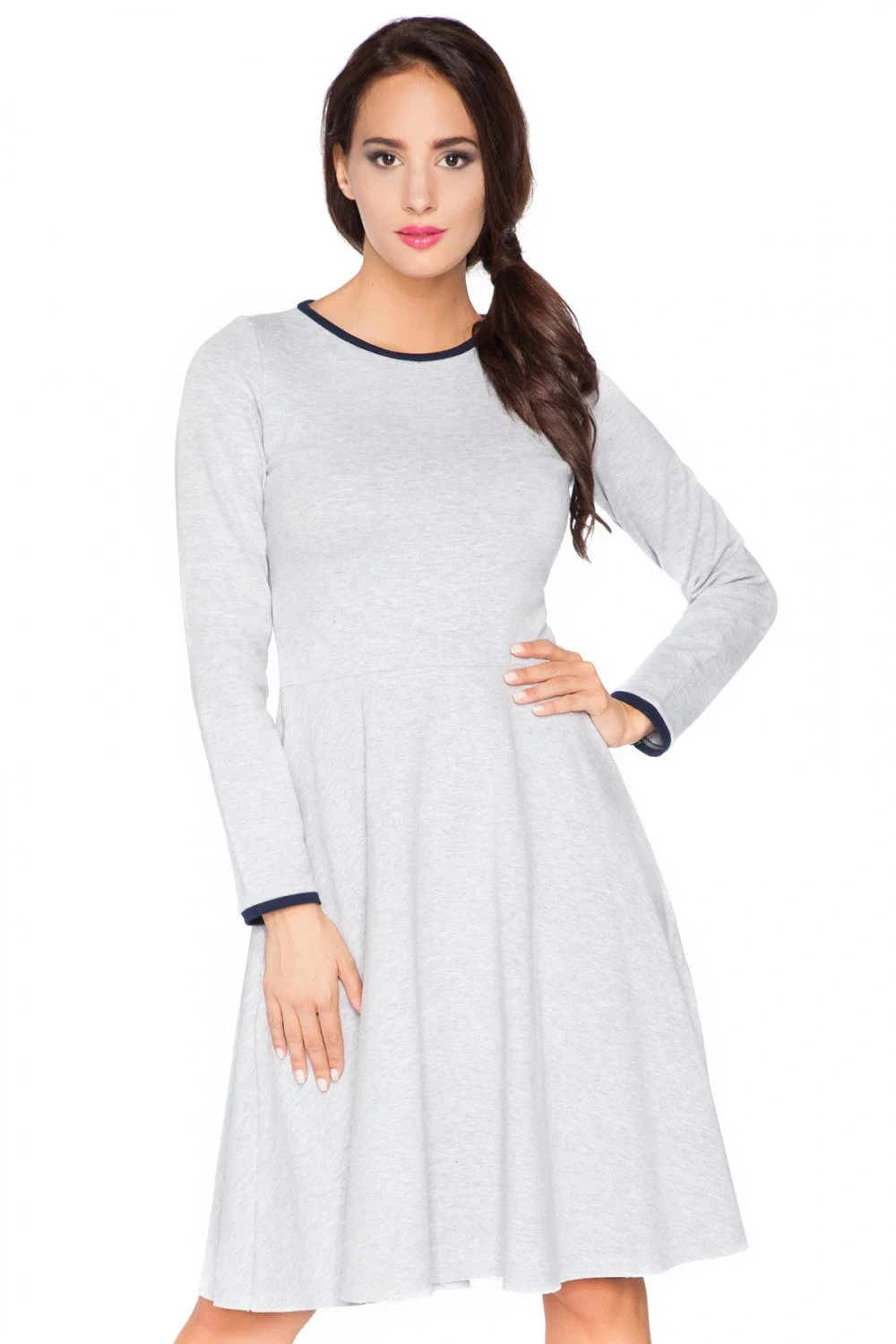 Šaty z pletené mikiny, v pase přestřižené. Výstřih a rukávy zakončené lemováním v kontrastní barvě. Spodní část šatů je rozšířená a ponechaná v surovém stavu.