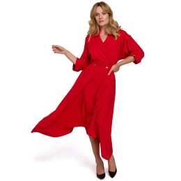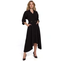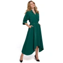 Dámské dlouhé šaty s kapsami, vrchní část prokládaný límec, spodní část asymetrická. V pase ozdoba - knoflíky.