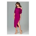 Efektní, asymetrické šaty se zvěšeným jedním ramenem a rozparkem. S volným, kimonovým vrškem a gumou v pase.