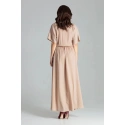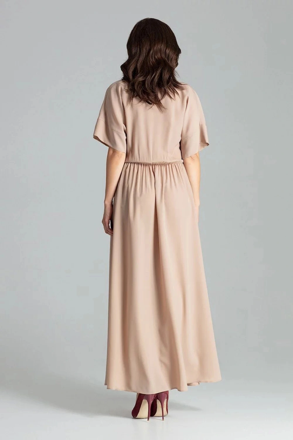 Béžové dlouhé šaty s krátkými kimonovými rukávy zakončenými manžetou. Dlouhá sukně je v pase přestřižená, mírně rozšířená s bočními rozparky. Pas s všitou gumičkou. Obálkový výstřih.