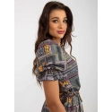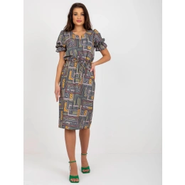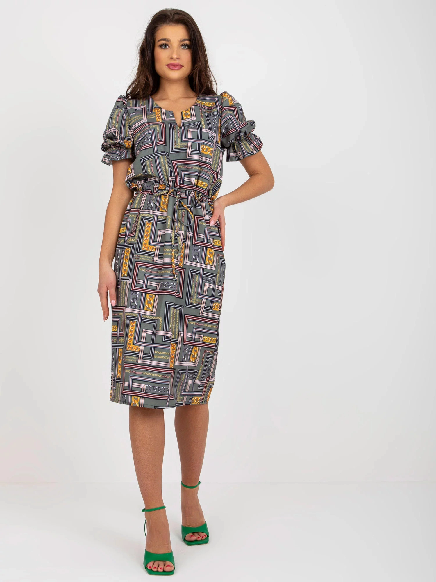 Khaki midi šaty s potiskem a krátkými rukávy .