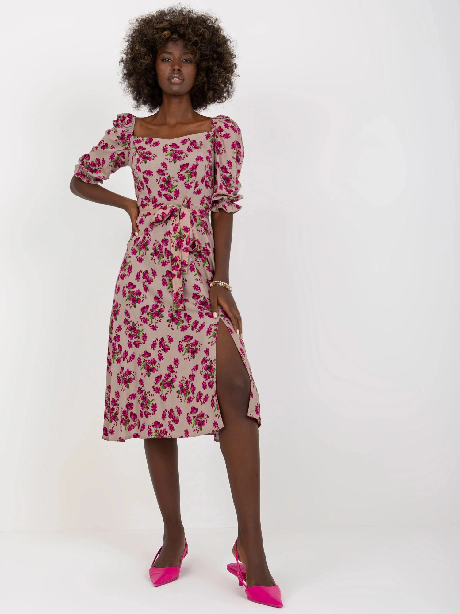 Modelka má na sobě velikost 36. Rozměry modelky: výška 168 cm, prsa 82 cm, pas 62 cm, boky 93 cm.