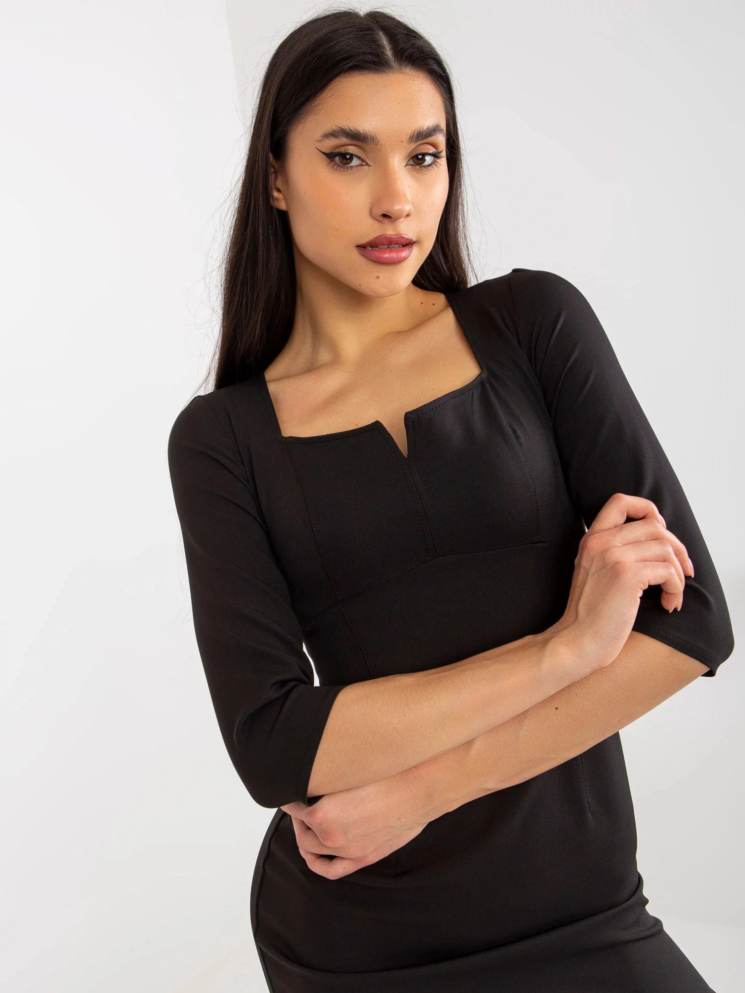 Černé mini koktejlové šaty s 3/4 rukávy.