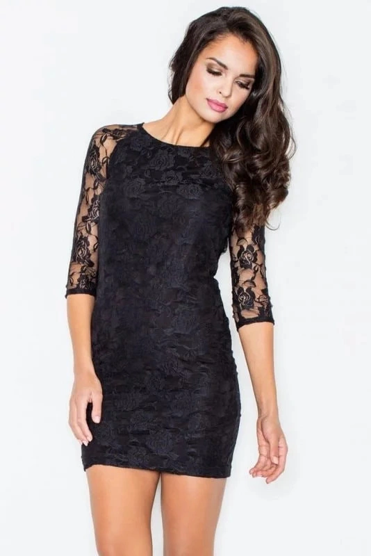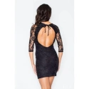 Dámské elegantní šaty M076 FIGL s odhalenými zády. Svrchní část šatů je oživená krajkou. Šaty mají 3/4 krajkové rukávy a délku nad kolena.