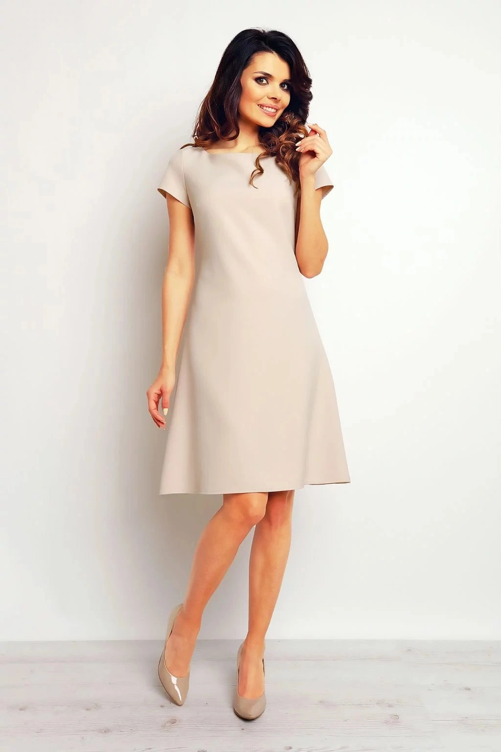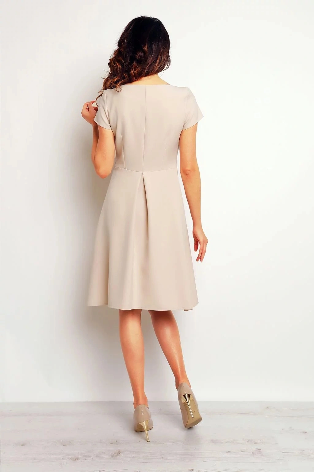 Dámské modré šaty z lehkého materiálu áčkového střihu s krátkými rukávy a zadním záhybem.